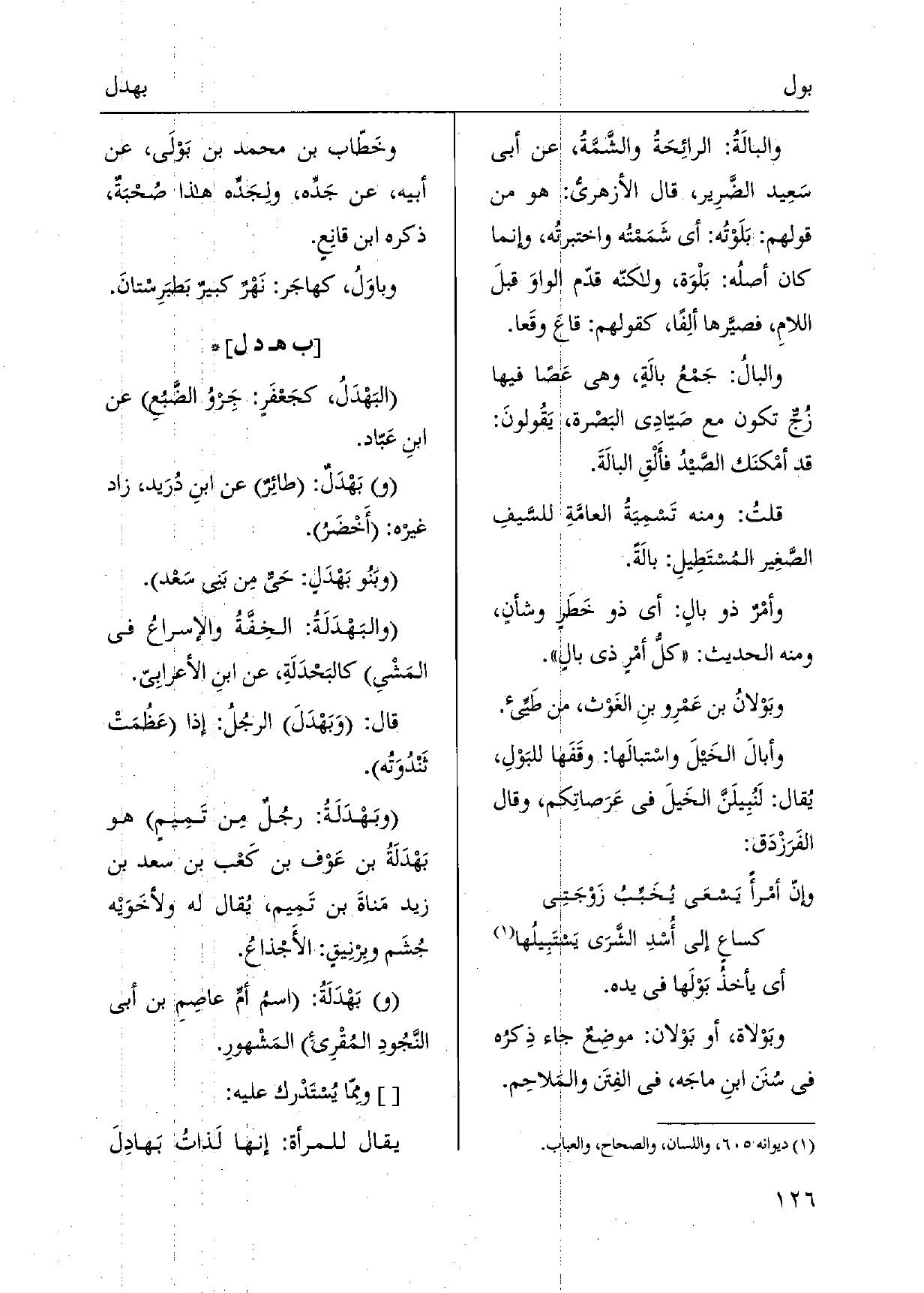 وَمِمَّا يسْتَدرك عَلَيْهِ: يُقَال للْمَرْأَة: إِنَّهَا لَذاتُ بَهادِلَ