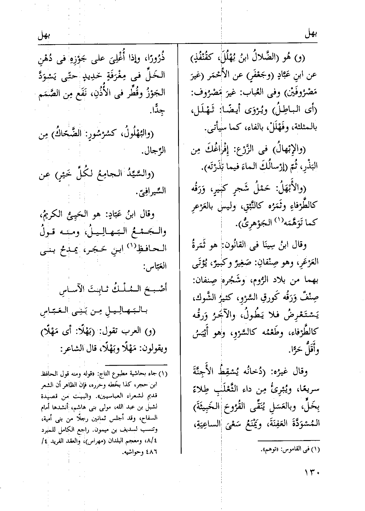 والإِبْهالُ فِي الزَّرْع: إِفْراغُكَ مِن البَذْرِ، ثُمّ إرْسالُكَ الماءَ فِيمَا بَذَرْتَه. والأَبْهَلُ: حَمْلُ شَجرٍ كبيرٍ، وَرَقُه كالطَّرفاءِ وثَمَرُه كالنَّبقِ، وَلَيْسَ بالعَرعرِ كَمَا تَوَهَّمَه الجَوْهرِيُّ. وَقَالَ ابنُ سِينَا فِي القانُون: هُوَ ثَمَرةُ العَرعَرِ، وَهُوَ صِنْفانِ: صَغِيرٌ وكبيرٌ، يُؤتَى بهما من بِلَاد الرّوم، وشَجُره صِنفان: صِنْفٌ وَرَقُه كَورقِ السَّروِ، كثيرُ الشَّوك، يَستَعْرِضُ فَلَا يَطُولُ، والآخَرُ وَرقُه كالطَّرفاء، وطَعْمُه كالسَّروِ، وَهُوَ أَيْبَسُ وأَقَل حَرّاً. وَقَالَ غيرُه: دُخانُه يُسقِطُ الأَجِنَّةَ سَرِيعا، ويُبرِئُ مِن دَاء الثَّعْلَبِ طِلاءً بِخَلٍّ، وبالعَسَلِ يُنَقِّي القُرُوحَ الخَبِيثَةَ المُسوَدَّةَ العَفِنَةَ، وَيمْنَعُ سَعْىَ الساعِيَةِ، ذُرُوراً، وَإِذا أُغْلِيَ على جَوْزِهِ فِي دُهْنِ الخَلِّ فِي مِغْرَفَةٍ حَدِيدٍ حتّى يسوَدَّ الجَوْزُ وقُطِّر فِي الأُذُنِ، نَفَع مِن الصَّمَم جِداً. والبُهْلُولُ، كسُرسُورٍ: الضَّحّاكُ مِن الرِّجَال. والسَّيِّدُ الجامِعُ لكُلِّ خَيرٍ عَن السِّيرافِيّ. وَقَالَ ابنُ عَبّادٍ: هُوَ الحَيِيُّ الكريمُ، والجَمْعُ البَهالِيلُ، وَمِنْه قولُ الحافظِ ابنِ حَجَر، يمدحُ بني العَبّاس: