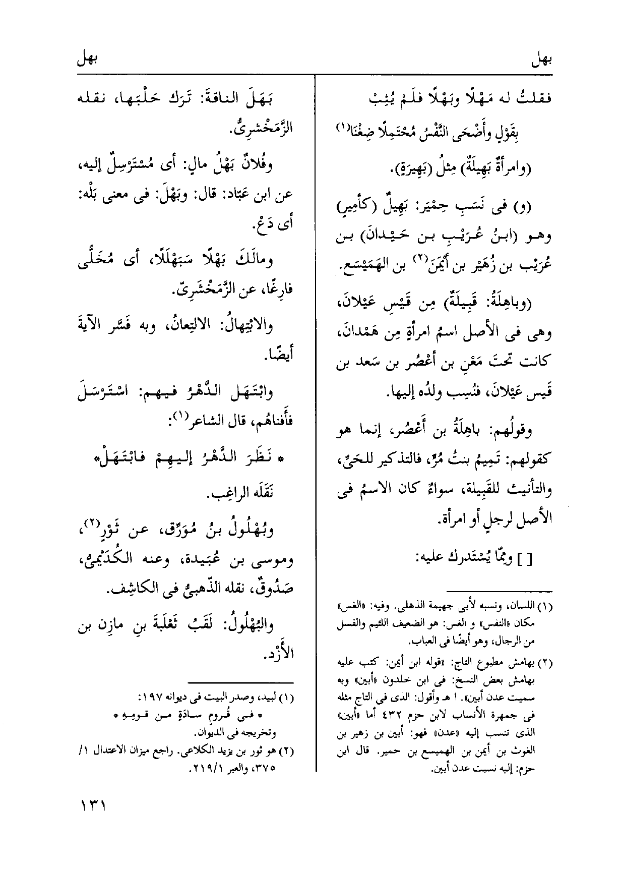 وامرأةٌ بَهِيلَةٌ مِثلُ بَهِيرَةٍ. فِي نَسَبِ حِمْيَر: بَهِيلٌ كأمِيرٍ وَهُوَ ابنُ عُرَيْبِ بن حَيدانَ بن عُرَيْب بن زُهَير بن أيمَنَ بن الهَمَيسَع. وباهِلَةُ: قَبِيلَةٌ مِن قَيسِ عَيلانَ، وَهِي فِي الأَصْل اسمُ امرأةٍ مِن هَمْدانَ، كَانَت تحتَ مَعْنِ بن أعْصُر بن سَعد بن قَيس عَيلانَ، فنُسِب ولدُه إِلَيْهَا. وقولُهم: باهِلَةُ بن أَعْصُر، إِنَّمَا هُوَ كَقَوْلِهِم: تَمِيمُ بنتُ مُرٍّ، فالتذكير للحَيِّ، والتأنيث للقَبِيلة، سواءٌ كَانَ الاسمُ فِي الأَصْل لرجلٍ أَو امْرَأَة.)