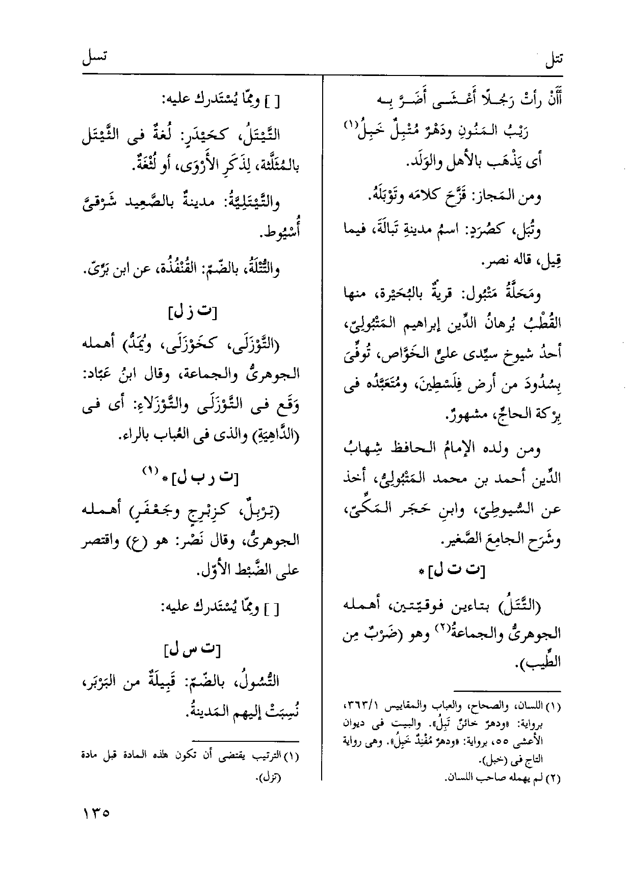 أَي يَذْهَب بالأهل والوَلَد. وَمن المَجاز: قَزَّحَ كلامَه وتَوْبَلَهُ. وتُبَل، كصُرَدٍ: اسمُ مدينةِ تَبالَةَ، فِيمَا قِيل، قَالَه نصر. ومَحَلَّةُ مَتْبُول: قريةٌ بالبُحَيرة، مِنْهَا القُطْبُ بُرهان الدِّين إِبْرَاهِيم المَتْبُولِيّ، أحدُ شُيُوخ سيِّدي عليٍّ الخَوَّاص، تُوفي بِسُدُودَ من أَرض فِلَسطِينَ، ومُتَعَبَّدُه فِي بِرْكة الحاجِّ، مشهورٌ. وَمن وَلَده الإمامُ الْحَافِظ شِهابُ الدِّين أَحْمد بن مُحَمَّد المَتْبُولِيُّ، أَخذ عَن السُّيوطِيّ، وابنِ حَجَر المَكِّيّ، وشَرَح الجامِعَ الصَّغير.