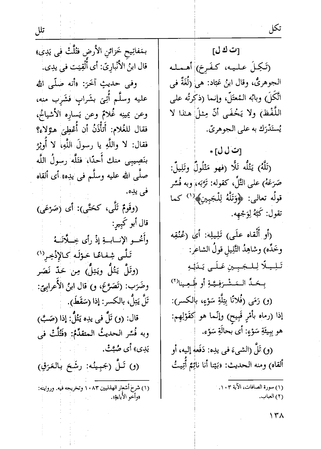 رَمَى فُلاناً} بِتِلَّةِ سَوْءٍ، بِالْكَسْرِ: إِذا رَمَاه بأمْرٍ قَبِيحٍ وإنّما هُوَ كقَوْلِهِم: هُوَ بِبِيئَةِ سَوْءٍ: أَي بحالَةِ سَوْء. (و) {تَلَّ الشَّيْء فِي يدِه: دَفَعه إِلَيْهِ، أَو أَلْقَاهُ وَمِنْه الحَدِيث: بَيْنا أَنا نائِمٌ أُتِيتُ بمَفاتِيحِ خَزائنِ الأَرْض فتُلَّتْ فِي يَدِي قَالَ ابنُ الأنْبارِيّ: أَي ألْقِيَت فِي يدِي. وَفِي حديثٍ آخَرَ: أَنه صلّى الله عَلَيْهِ وسلَّم أُتِىَ بشَرابٍ فشَرِب مِنْهُ، وَعَن يمينِه غُلامٌ وَعَن يَسارِه الأشياخُ، فَقَالَ للغُلام: أَتأْذَنُ أَن أُعْطِيَ هَؤُلَاءِ فَقَالَ: لَا واللَّهِ يَا رسولَ اللَّهِ، لَا أُوثِرُ بنَصِيبِي مِنْك أَحداً،} فتَلَّه رسولُ اللَّه صلَّى الله عَلَيْهِ وسلَّم فِي يدِه أَي أَلْقَاهُ فِي يدِه. وقَومٌ {تَلَّى، كحَتَّى: أَي صَرْعَى قَالَ أَبُو كَبِيرٍ: