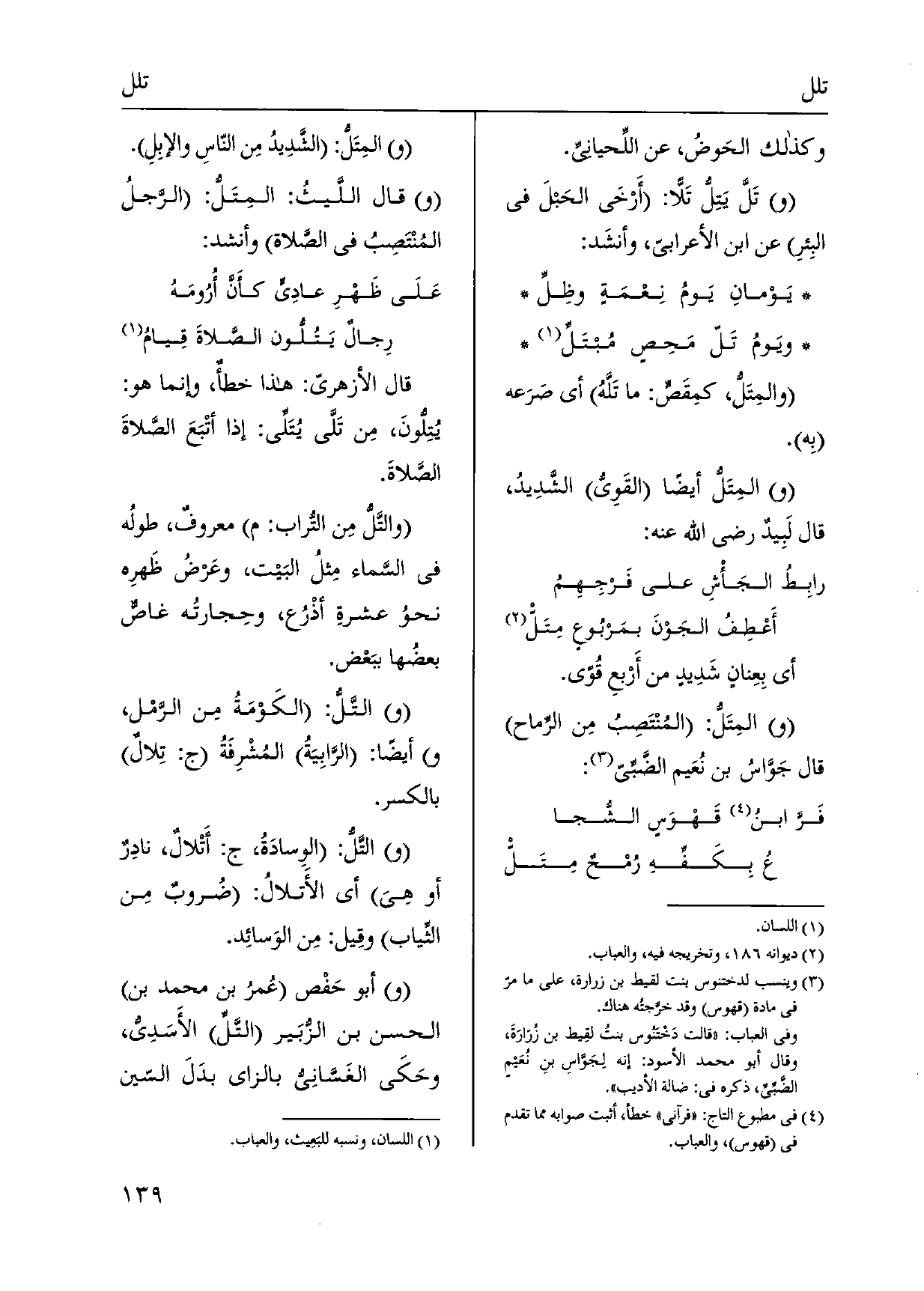 قَالَ الأزهريّ: هَذَا خطأٌ، وَإِنَّمَا هُوَ: {يُتِلُّونَ، مِن تَلَّى يُتَلِّى: إِذا أتْبَعَ الصَّلاةَ الصَّلاةَ.} والتَّلُّ مِن التُّراب: م معروفٌ، طولُه فِي السَّماء مِثلُ البَيت، وعَرضُ ظَهرِه نحوُ عشرةِ أذْرُع، وحِجارتُه غاصٌّ بعضُها ببَعْض. (و) {التَّلُّ: الكَوْمَةُ مِن الرَّمْل، أَيْضا: الرَّابِيَةُ المُشْرِفَةُ ج:} تِلالٌ بِالْكَسْرِ. التَّلُّ: الوِسادَةُ، ج: {أَتْلالٌ، نادِرٌ أَو هِيَ أَي} الأَتلالُ: ضُروبٌ مِن الثِّياب وقِيل: مِن الوَسائِد. أَبُو حَفْص عُمرُ بن مُحَمَّد بن الْحسن بن الزُّبَير! التَّلِّ الأَسَدِيُّ، وحَكَى الغَسَّانِي بالزاي بدَلَ السّين