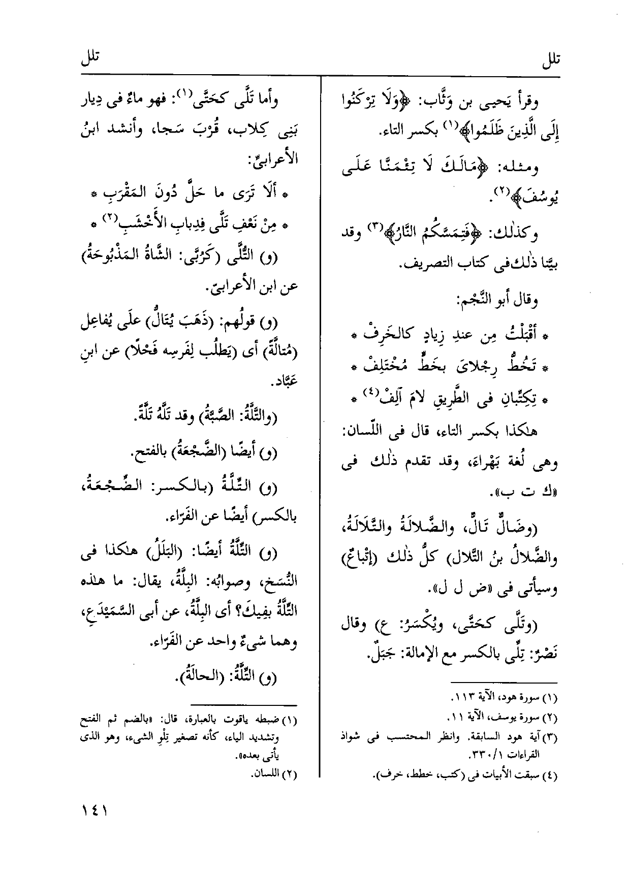 وَقَرَأَ يَحيى بن وَثَّاب: وَلَا تِركَنوا إِلَى الَّذِينَ ظَلَمُوا بِكَسْر التَّاء. وَمثله: مَالَكَ لَا تِئْمَنَّا عَلَى يُوسُفَ. وَكَذَلِكَ: فَتِمَسَّكُمُ النَّارُ وَقد بيّنا ذَلِك فِي كتاب التصريف. وَقَالَ أَبُو النَّجْم: أقْبَلْتُ مِن عندِ زِيادٍ كالخَرِفْ تَخُطُّ رِجلايَ بخَط مخْتَلِفْ تِكِتِّبانِ فِي الطَّرِيقِ لامَ الِفْ هَكَذَا بِكَسْر التَّاء، قَالَ فِي اللّسان: وَهِي لُغة بَهْراءَ، وَقد تقدم ذَلِك فِي ك ت ب. وضَالٌّ {تَالٌّ، والضَّلالَةُ} والتَّلَالَةُ، والضَّلالُ بنُ {التَّلال كل ذَلِك إتباعٌ وَسَيَأْتِي فِي ض ل ل.} وتَلَّى كحَتَّى، ويُكْسَرُ: ع وَقَالَ نَصْرٌ: {تِلِّي بِالْكَسْرِ مَعَ الإمالة: جَبَلٌ. وَأما} تَلَّى كحَتَّى: فَهُوَ ماءٌ فِي دِيار بني كِلاب، قُبَ سَجا، وَأنْشد ابنُ الأعرابيِّ: ألَا تَرَى مَا حَلَّ دُونَ المَقْرَبِ مِنْ نَعْفِ تَلَّى فِدِبابِ الأَخْشَبِ (و) {التُّلَّى كَرُبَّى: الشَّاةُ المَذْبُوحَةُ عَن ابْن الْأَعرَابِي. قولُهم: ذَهَبَ} يُتَالُّ علَى يُفاعِل {مُتالَّةً أَي يَطلُب لِفَرسِه فَحلاً عَن ابنِ عَبَّاد.} والتَّلَّةُ: الصَّبَّةُ وَقد تَلَّهُ تَلَّةً. أَيْضا الضَّجْعَةُ بِالْفَتْح. (و) ! التِّلَّةُ بِالْكَسْرِ: الضِّجْعَةُ، بِالْكَسْرِ أَيْضا عَن الفَرّاء. التِّلَّةُ أَيْضا: البَلَلُ هَكَذَا فِي النُّسَخ، وصوابُه: البِلَّةُ، يُقَال: مَا هَذِه التِّلَّةُ بفِيكَ أَي البِلَّةُ، عَن أبي السَّمَيْدَعِ، وهما شيءٌ وَاحِد عَن الفَرّاء. التِّلَّةُ: الحالَةُ.