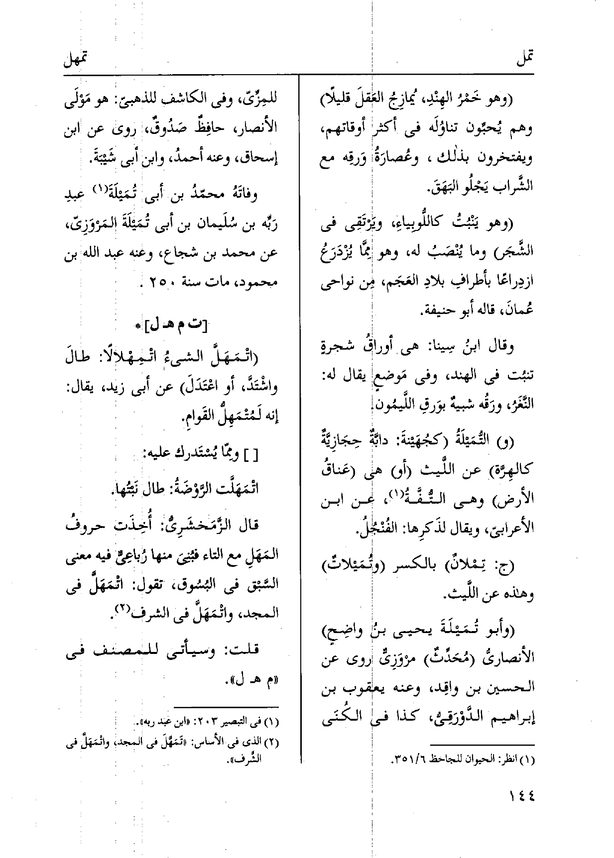 وَهُوَ خَمْرُ الهِنْدِ، ُ يمازِجُ العَقلَ قَلِيلا وهم يُحبِّون تناوُلَه فِي أَكثر أوقاتهم، ويفتخرون بذلك، وعُصارَةُ وَرقِه مَعَ الشَّراب يَجْلُو البَهَقَ. وَهُوَ يَنْبُتُ كاللُّوبياءِ، ويَرتَقِى فِي الشَّجَر وَمَا يُنْصَبُ لَهُ، وَهُوَ مِمَّا يُزْدَرَعُ ازدِراعاً بأطرافِ بلادِ العَجَم، مِن نواحي عُمانَ، قَالَه أَبُو حنيفَة. وَقَالَ ابنُ سِينا: هِيَ أوراقُ شجرةٍ تنبُت فِي الْهِنْد، وَفِي مَوضعٍ يُقَال لَهُ: النَّغَرُ، ورَقُه شبيهٌ بوَرقِ اللَّيمُون. التُّمَيلَةُ كجُهَيْنةَ: دابَّةٌ حِجَازِيَّةٌ كالهَرَّة عَن اللَّيث أَو هِيَ عَناقُ الأَرْض وَهِي التُّفَّةُ، عَن ابْن الْأَعرَابِي، وَيُقَال لذَكرِها: الفُنْجُلُ. ج: تِمْلانٌ بِالْكَسْرِ وتُمَيْلاتٌ وَهَذِه عَن اللَّيث. وَأَبُو تُمَيلَةَ يحيى بنُ واضِحٍ الأنصاريّ مُحَدِّثٌ مروَزِيٌّ روى عَن الْحُسَيْن بن واقِد، وَعنهُ يَعْقُوب بن إِبْرَاهِيم الدَّوْرَقِيُّ، كَذَا فِي الكُنَى للمِزِّيّ، وَفِي الكاشف للذهبي: هُوَ مَولَى الْأَنْصَار، حافِظٌ صَدُوقٌ، روى عَن ابْن إِسْحَاق، وَعنهُ أحمدُ، وَابْن أبي شَيبَةَ. وفاتَهُ محمّدُ بن أبي تُمَيْلَةَ عبدِ رَبِّه بن سُلَيمان بن أبي تُمَيلَةَ المَروَزِيّ، عَن مُحَمَّد بن شُجَاع، وَعنهُ عبد الله بن مَحْمُود، مَاتَ سنة.