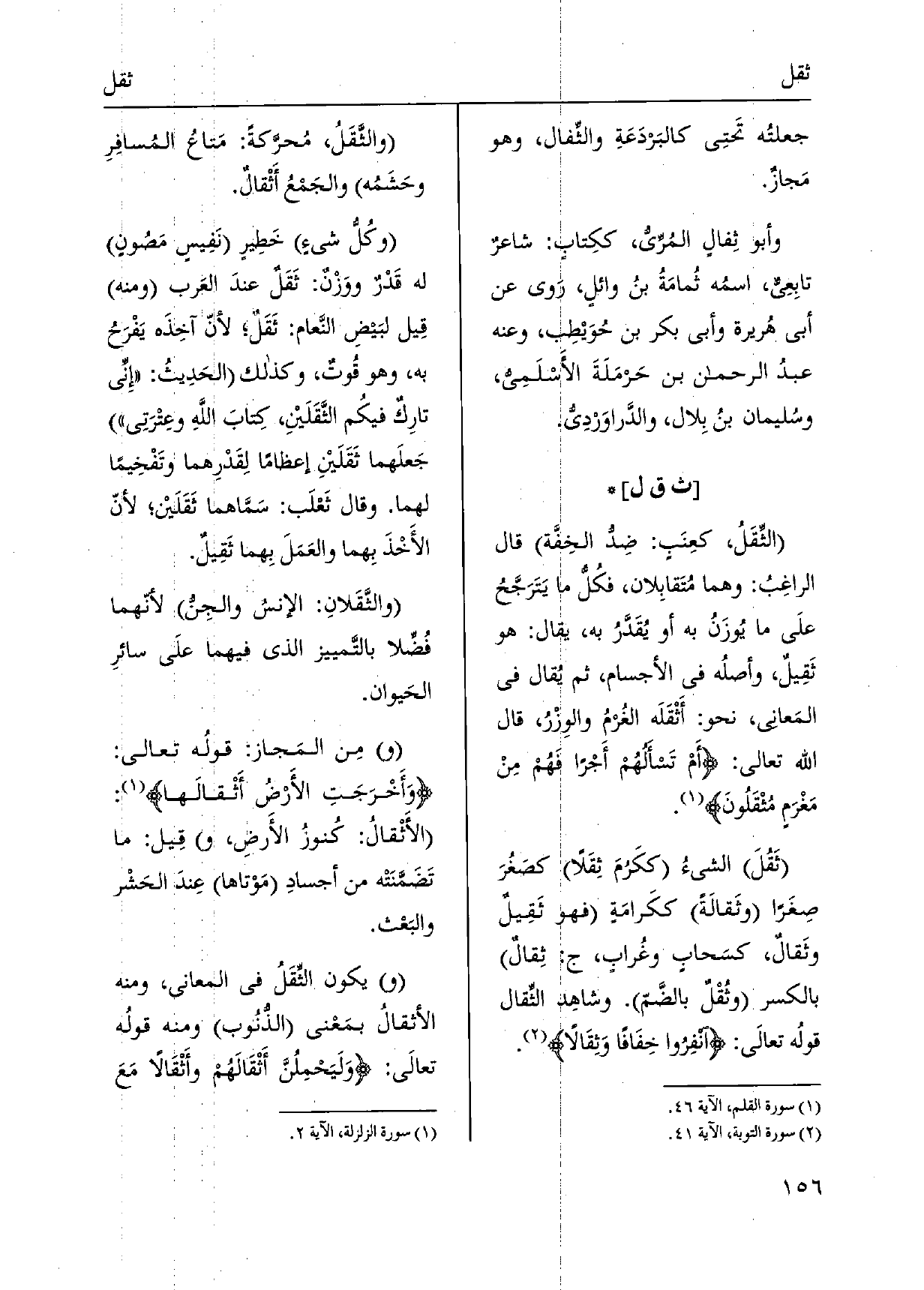 الثِّقَلُ، كعِنَبٍ: ضِدُّ الخِفَّة قَالَ الراغِبُ: وهما مُتَقابِلان، فكُلُّ مَا يَتَرَجَّحُ علَى مَا يُوزَنُ بِهِ أَو يُقَدَّرُ بِهِ، يُقَال: هُوَ ثَقِيلٌ، وأصلُه فِي الْأَجْسَام، ثمَّ يُقال فِي المَعاني، نَحْو: أَثْقَلَه الغُرمُ والوِزْرُ، قَالَ الله تَعَالَى: أَمْ تَسألهُم أَجْراً فَهُم مِن مَغْرَمٍ مُثْقَلونَ. ثَقُلَ الشَّيْء ككَرُمَ ثِقَلاً كصَغُرَ صغَراً وثَقالَةً ككَرامَةٍ فَهُوَ ثَقِيلٌ وثَقالٌ، كسَحابٍ وغُرابٍ، ج: ثِقالٌ بِالْكَسْرِ وثُقْلٌ بالضَّمّ. وشاهِد الثِّقال قولُه تعالَى: أنفِروا خِفَافاً وَثِقَالاً. والثَّقَلُ، مُحرَّكة: مَتاعُ المُسافِرِ وحَشَمُه والجَمعُ أَثْقالٌ. وكُلُّ شيءٍ خَطِرٍ نَفِيسٍ مَصُونٍ لَهُ قَدْرٌ ووَزْنٌ: ثَقَلٌ عندَ العَرب وَمِنْه قِيل لبَيضِ النَّعام: ثَقَل لأنّ آخِذَه يَفْرَحُ بِهِ، وَهُوَ قُوتٌ، وَكَذَلِكَ الحَدِيث: إنِّي تارِكٌ فيكُم الثَّقَلَيْنِ، كِتابَ اللَّهِ وعِتْرَتِي جَعلَهما ثَقَلَيْنِ إعظاماً لِقَدْرِهما وتَفْخِيماً لَهما. وَقَالَ ثَعْلَب: سَمَّاهما ثَقَلَيْن لأنّ الأَخْذَ بِهما والعَمَلَ بِهما ثَقِيلٌ. والثَّقَلانِ: الإنسُ والجِنُّ لِأَنَّهُمَا فُضِّلا بالتَّمييز الَّذِي فيهمَا علَى سائرِ الحَيوان. مِن المَجاز: قولُه تَعَالَى: وَأَخْرَجَتِ الأَرْضُ أَثْقالَها: الأَثْقالُ: كُنوزُ الأَرضِ، قِيل: مَا تَضَمَّنَتْه من أجسادِ مَوْتاها عِندَ الحَشْر والبَعْث. يكون الثِّقَلُ فِي الْمعَانِي، وَمِنْه الأثقالُ بمَعْنى الذنُوب وَمِنْه قولُه تعالَى: وَلَيَحْمِلُنَّ أَثْقَالَهُم وأَثْقَالاً مَعَ