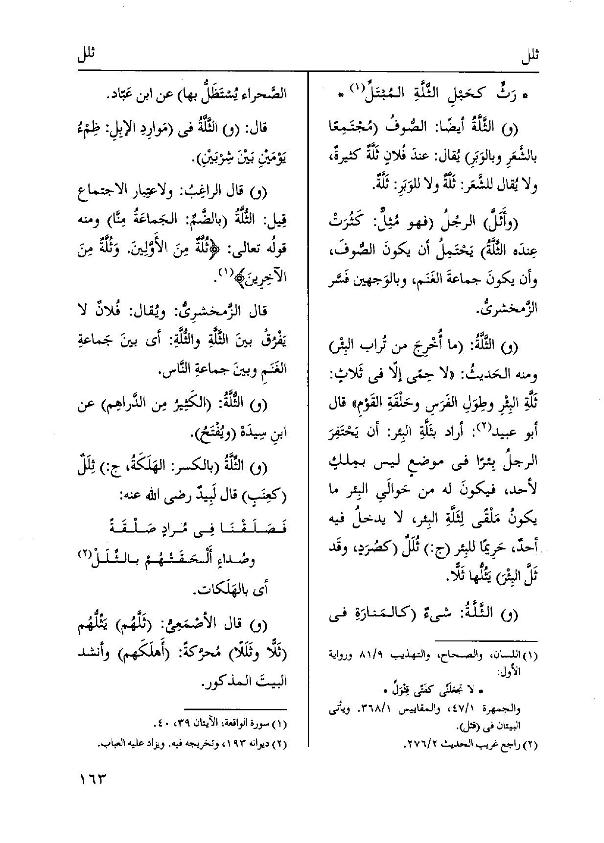 رَث كحَبلِ {الثلَّةِ المُبتَلِّ الثَّلَّةُ أَيْضا: الصُّوفُ مُجْتَمِعاً بالشَّعَرِ وبالوَبَرِ يُقال: عندَ فُلانٍ} ثَلَّةٌ كثيرةٌ، وَلَا يُقال للشَّعَر: ثَلَّةٌ وَلَا للوَبَرِ: ثَلَّةٌ. {وأَثَلَّ الرجُلُ فَهُوَ} مُثِلٌّ: كَثُرَتْ عِندَه {الثَّلَّةُ يَحْتَمِلُ أَن يكونَ الصُّوفَ، وَأَن يكونَ جماعةَ الغَنَم، وبالوَجهين فَسَر الزَّمخشريُّ. الثَّلَّةُ: مَا أُخْرِج من تُراب البِئْر وَمِنْه الحَديثُ: لَا حِمًى إلّا فِي ثَلاثٍ: ثَلَّةِ البِئْرِ وطِوَلِ الفَرَسِ وحَلْقَةِ القَوْمِ قَالَ أَبُو عبيد: أَرَادَ} بثَلَّةِ البِئر: أَن يَحْتَفِرَ الرجلُ بِئراً فِي موضعٍ لَيْسَ بمِلكٍ لأحد، فيكونَ لَهُ من حَوالَىِ البِئر مَا يكونُ مَلْقى {لِثَلَّةِ البِئر، لَا يدخلُ فِيهِ أحدٌ، حَرِيماً للبِئر ج:} ثُلَلٌ كصُرَدٍ، وقَد {ثَلَّ البِئْرَ} يَثُلُّها {ثَلّاً. (و) } الثَّلَّةُ: شَيْء كالمَنارَةِ فِي الصَّحراء يُسْتَظَلُّ بهَا عَن ابْن عَبّاد. قَالَ: (و) {الثَّلَّةُ فِي مَوارِدِ الإبِلِ: ظِمءُ يَوْمَيْنِ بَيْنَ شِربَيْنِ. قَالَ الراغِبُ: ولاعتِبار الِاجْتِمَاع قِيل:} الثُّلَّةُ بالضَّم: الجَماعَةُ مِنَّا وَمِنْه قولُه تَعَالَى: {ثُلَّةٌ مِنَ الأَوَّلِينَ.} وَثُلَّةٌ مِنَ الآخِرِينَ. قَالَ الزَّمشرِيُّ: ويُقال: فُلانٌ لَا يَفْرُقُ بينَ {الثَّلَّةِ} والثُّلَّةِ: أَي بينَ جَماعةِ الغَنَمِ وبينَ جماعةِ النَّاس. (و) {الثُّلَّةُ: الكَثِيرُ مِن الدَّراهِم عَن ابنِ سِيدَ ويُفْتَحُ. (و) } الثِّلَّةُ بِالْكَسْرِ: الهَلَكَةُ، ج: {ثِلَلٌ كعِنَبٍ قَالَ لَبِيدٌ رَضِي الله عَنهُ: