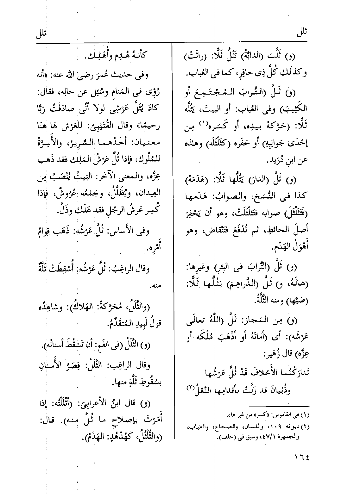 كأنهُ هُدِم وأُهْلِك. وَفِي حَدِيث عُمرَ رَضِي الله عَنهُ: أَنه رُؤِى فِي المَنامِ وسُئِل عَن حالِه، فَقَالَ: كادَ} يُثَل عَرشِي لَوْلَا إِنِّي صادَفْتُ رَبّاً رحِيما وَقَالَ القُتَيبِي: للعَرش هَاهنَا مَعْنيانِ: أحدُهما السَّرِيرُ، والأَسرَّةُ للمُلُوك، فَإِذا {ثُلَّ عَرش المَلِك فقد ذَهب عِزه، وَالْمعْنَى الآخَر: البَيتُ يُنْصَبُ مِن العِيدان، ويُظَلَّلُ، وجَمْعُه عُرُوشٌ، فَإِذا كُسِر عَرشُ الرجُلِ فقد هَلَك وذَلَّ. وَفِي الأساس: ثلَّ عَرشه: ذَهَب قِوامُ أَمْرِه. وَقَالَ الراغِبُ: ثُلَّ عَرشُه: أُسْقِطَتْ} ثَلَّةٌ مِنْهُ. {والثَّلَلُ، مُحَرَّكةً: الهَلاكُ: وشاهِدُه قولُ لَبِيدٍ المُتقدِّمُ. (و) } الثَّلَل فِي الفَمِ: أَن تَسْقُطَ أسنانُه. وَقَالَ الراغِب: الثَّلَلُ: قِصَرُ الأَسنانِ بسُقُوطِ {ثَلَّةٍ مِنْهَا. قَالَ ابنُ الْأَعرَابِي:} أثْلَلْتُه: إِذا أَمَرتَ بإصلاحِ مَا ثُلَّ مِنْهُ.