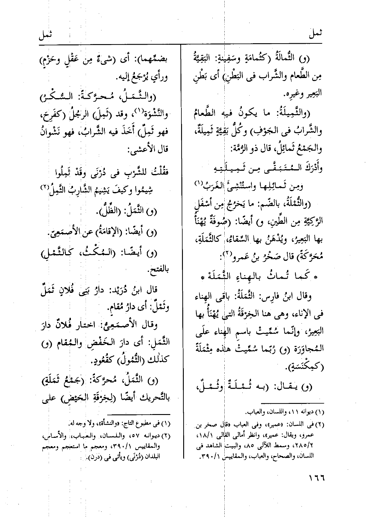الثَّمَلُ: الظِّلُّ. أَيْضا: الإقامَةُ عَن الأصمَعِي. أَيْضا: المُكْثُ، كالثَّمْلِ بِالْفَتْح. قَالَ ابنُ دُرَيْد: دارُ بني فُلانٍ ثَمَل وثَمْلٌ: أَي دارُ مُقامٍ. وَقَالَ الأصمَعِيُّ: اخْتَار فُلان دارَ الثَّمَلِ: أَي دارَ الخَفْضِ والمُقام كَذَلِك الثُّمُولُ كقُعُودٍ. الثَّمَلُ، مُحرَّكةً: جَمْعُ ثَمَلَةٍ بالتَّحريك أَيْضا لِخِرْقَةِ الحَيضِ على