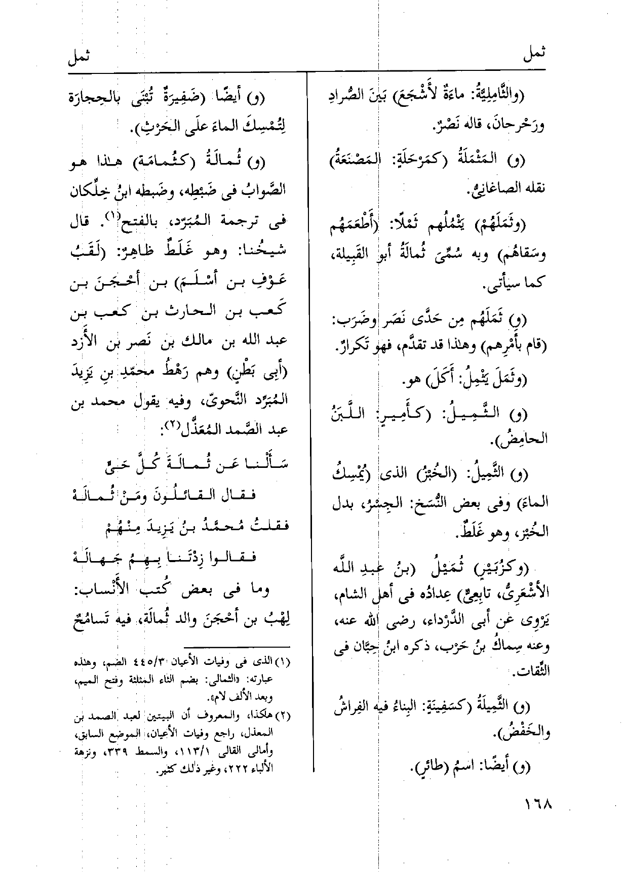 والثَّامِلِيَّةُ: ماءَةٌ لأشْجَعَ بَينَ الصُّرادِ ورَحْرحانَ، قَالَه نَصْرٌ. المَثْمَلَةُ كمَرْحَلَةٍ: المَصْنَعَةُ نَقله الصاغانيّ. وثَمَلَهُم يَثْمُلُهم ثَمْلاً: أَطْعَمَهُم وسَقاهُم وَبِه سُمِّيَ ثُمالَة أَبُو القَبِيلة، كَمَا سَيَأْتِي. ثَمَلَهُم مِن حَدَّى نَصَر وضَرَب: قَامَ بأَمْرِهم وَهَذَا قد تقدَّم، فَهُوَ تَكرارٌ. وثَمَلَ يَثْمِلُ: أَكَلَ هُوَ. الثَّمِيلُ: كأَمِيرٍ: اللَّبنُ الحامِضُ. الثَّمِيلُ: الخُبزُ الَّذِي يمْسِكُ الماءَ وَفِي بعض النُّسَخ: الجِسرُ، بدل الخُبز، وَهُوَ غَلَطٌ. وكزُبَيرٍ ثُمَيلُ بنُ عبدِ اللَّه الأشْعَرِيُّ، تابِعِيٌّ عِدادُه فِي أهل الشَّام، يَروِي عَن أبي الدَّرْداء، رَضِي الله عَنهُ، وَعنهُ سِماكُ بنُ حَرب، ذكره ابنُ حِبَّان فِي الثِّقات. الثَّمِيلَةُ كسَفِينَةٍ: البِناءُ فِيهِ الفِراشُ والخَفْضُ. أَيْضا: اسمُ طائرٍ. أَيْضا ضَفِيرَةٌ تُبْنَى بالحِجارَة لِتُمْسِكَ الماءَ علَى الحَرثِ. ثُمالَةُ كثُمامَة هَذَا هُوَ الصَّوابُ فِي ضَبطِه، وضَبطه ابنُ خِلِّكان فِي تَرْجَمَة المُبَرّد، بِالْفَتْح. قَالَ شيخُنا: وَهُوَ غَلَطٌ ظاهِرٌ: لَقَبُ عَوْفِ بن أسْلَمَ بن أحْجَنَ بن كَعب بن الْحَارِث بن كَعْب بن عبد الله بن مَالك بن نَصر بن الأَزد أبي بَطْنٍ وهم رَهْطُ محمّدِ بنِ يَزِيدَ المُبَرَّد النَّحويّ، وَفِيه يَقُول مُحَمَّد بن عبد الصَّمد المُعَذَّل: