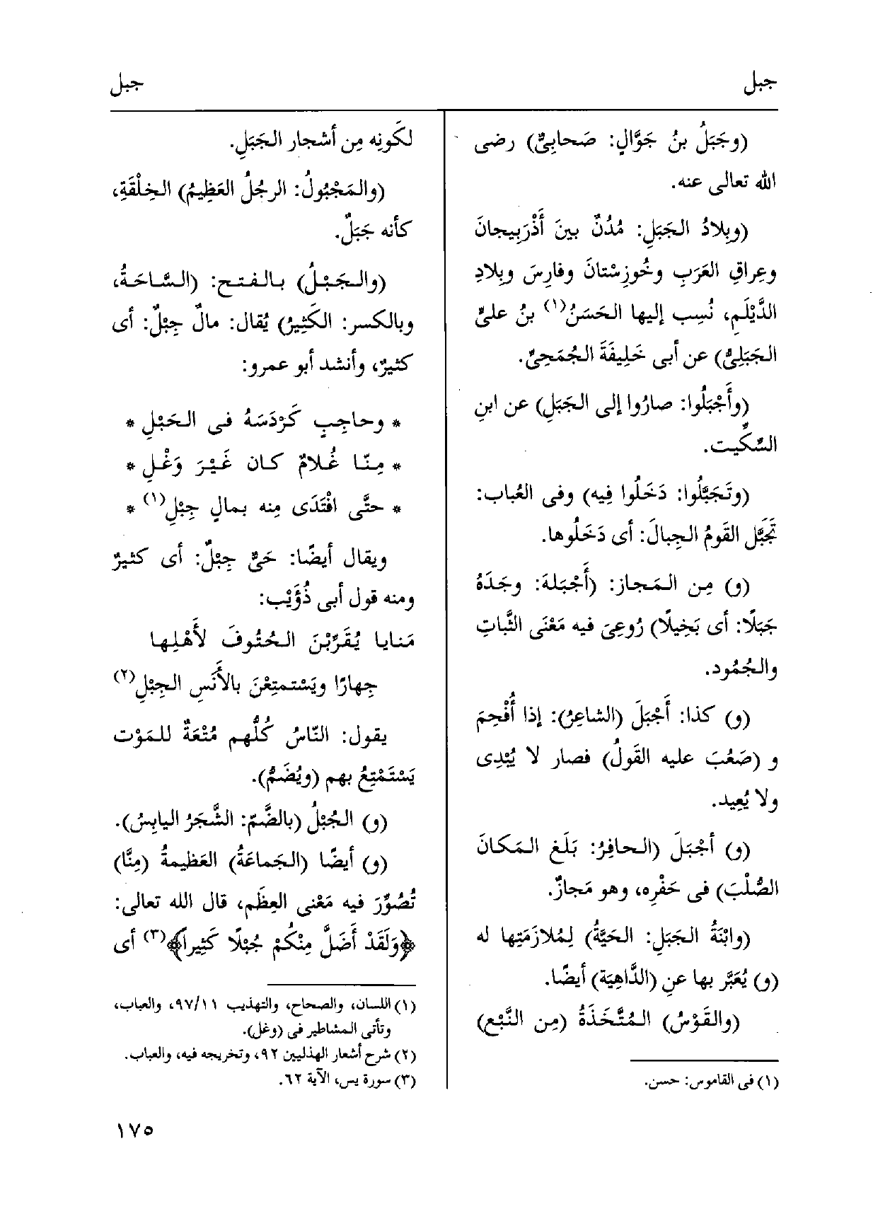 وجَبَلُ بنُ جَوَّالٍ: صَحابِيٌّ رَضِي الله تَعَالَى عَنهُ. وبلادُ الجَبَلِ: مُدُنٌ بينَ أَذْرَبِيجانَ وعِراقِ العَرَبِ وخُوزِسْتانَ وفارِسَ وبلادِ الدَّيْلَمِ، نُسِب إِلَيْهَا الحَسَنُ بنُ عَليّ الجَبَلِيُّ عَن أبي خَلِيفَةَ الجُمَحِي. وأَجْبَلُوا: صارُوا إِلَى الجَبَلِ عَن ابنِ السِّكِّيت. وتَجَبَّلُوا: دَخَلُوا فِيه وَفِي العُباب: تَجَبَّل القَومُ الجِبالَ: أَي دَخَلُوها. مِن المَجاز: أَجْبَلهَ: وجَدَهُ جَبَلاً: أَي بَخِيلاً رُوعِيَ فِيهِ مَعْنَى الثَّباتِ والجُمُود. كَذَا: أَجْبَلَ الشاعِرُ: إِذا أُفْحِمَ صَعُبَ عَلَيْهِ القَولُ فَصَارَ لَا يُبدِي وَلَا يُعِيد. أجْبَلَ الحافِرُ: بَلَغ المَكانَ الصُّلْبَ فِي حَفْرِه، وَهُوَ مَجازٌ. وابْنَةُ الجَبَلِ: الحَيَّةُ لِمُلازَمَتِها لَهُ يُعَبَّر بهَا عنِ الدَّاهِيَة أَيْضا. والقَوْسُ المُتَّخَذَةُ مِن النَّبع لكَونِه مِن أَشجَار الجَبَلِ. والمَجْبُولُ: الرجُلُ العَظِيمُ الخِلْقَةِ، كَأَنَّهُ جَبَلٌ. والجَبلُ بِالْفَتْح: السَّاحَةُ، وبالكسر: الكَثِير يُقال: مالٌ جِبلٌ: أَي كثيرٌ، وَأنْشد أَبُو عَمْرو: وحاجبٍ كَردَسَهُ فِي الحَبلِ مِنّا غُلامٌ كَانَ غَيرَ وَغْلِ حتَّى افْتَدَى مِنه بمالٍ جِبلِ وَيُقَال أَيْضا: حَيٌّ جِبلٌ: أَي كثيرٌ وَمِنْه قَول أبي ذُؤَيْب: