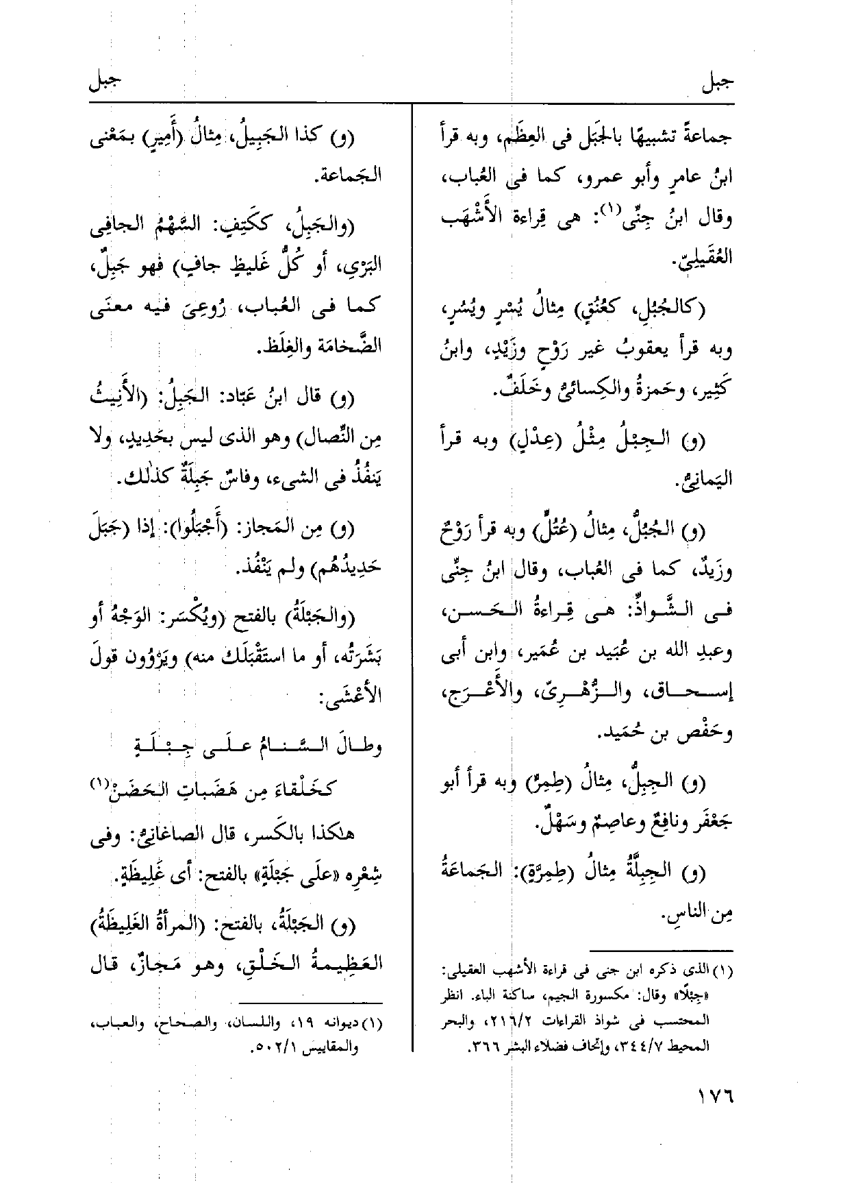تَشْبِيها بالجَبَل فِي العِظَم، وَبِه قَرَأَ ابنُ عامرٍ وَأَبُو عَمْرو، كَمَا فِي العُباب، وَقَالَ ابنُ جِنِّي: هِيَ قِراءة الأَشْهَب الْعقيلِيّ. كالجُبُلِ، كعُنُقٍ مِثالُ يُسْرٍ ويُسُرٍ، وَبِه قَرَأَ يعقوبُ غير رَوْحٍ وزَيْدٍ، وابنُ كَثِير، وحَمزةُ والكِسائي وخَلَفٌ. الجِبلُ مِثْلُ عِدْلٍ وَبِه قَرَأَ اليَمانيُّ. الجُبُل، مِثالُ عُتُل وَبِه قَرَأَ رَوْحٌ وزَيدٌ، كَمَا فِي العُباب، وَقَالَ ابنُ جِنِّي فِي الشَّواذِّ: هِيَ قِراءةُ الحَسن، وعبدِ الله بن عُبَيد بن عُمَير، وَابْن أبي إِسْحَاق، والزُّهْرِيّ، والأَعْرَج، وحَفْص بن حُمَيد. الجِبِلُّ، مِثالُ طِمِرٍّ وَبِه قَرَأَ أَبُو جَعْفَر ونافِعٌ وعاصِمٌ وسَهْلٌ. الجِبِلَّةُ مِثالُ طِمِرَّةٍ: الجَماعَةُ مِن النَّاس. كَذَا الجَبِيلُ، مِثالُ أَمِيرٍ بمَعْنى الجَماعة. والجَبِلُ، ككَتِفٍ: السَّهْمُ الجافِي البَريِ، أَو كُلُّ غَليظٍ جافٍ فَهُوَ جَبِلٌ، كَمَا فِي العُباب، رُوعِيَ فِيهِ معنَى الضَّخامَة والغِلَظ. قَالَ ابنُ عَبّاد: الجَبِلُ: الأَنِيثُ مِن النِّصال وَهُوَ الَّذِي لَيْسَ بحَدِيدٍ، وَلَا يَنفُذُ فِي الشَّيْء، وفاسٌ جَبِلَةٌ كَذَلِك. مِن المَجاز: أَجْبَلُوا: إِذا جَبَلَ حَدِيدُهُم وَلم يَنْفُذ. والجَبلَةُ بِالْفَتْح ويُكْسَر: الوَجْهُ أَو بَشَرَتُه، أَو مَا استَقْبَلَك مِنْهُ ويَروُون قولَ الأعْشَى: