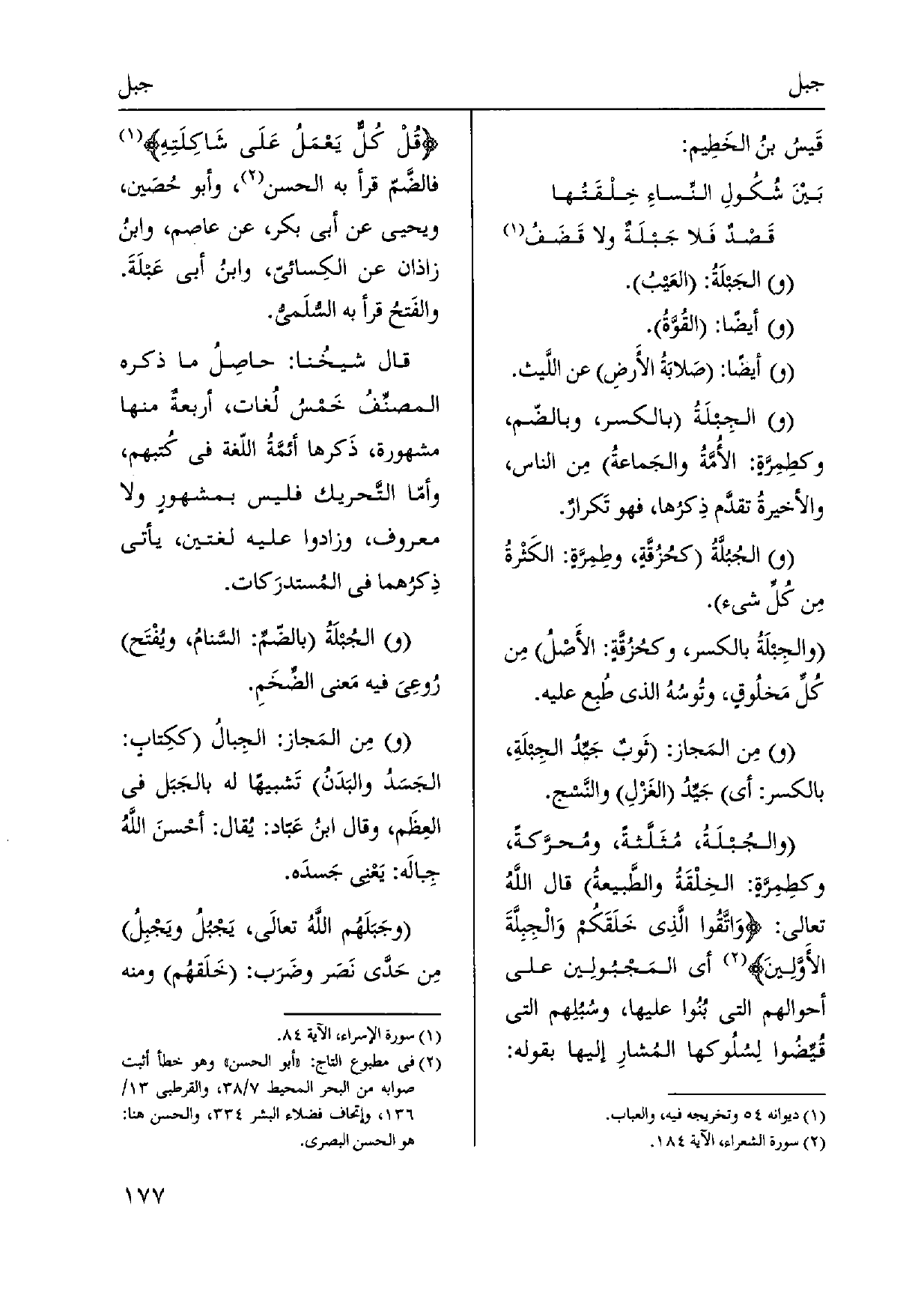 الجَبلَةُ: العَيبُ. أَيْضا: القوَّةُ. أَيْضا: صَلابَةُ الأَرضِ عَن اللَّيث. الجِبلَةُ بِالْكَسْرِ، وبالضّم، وكطِمِرَّةٍ: الأُمَّةُ والجَماعةُ مِن النَّاس، والأخيرةُ تقدَّم ذِكرُها، فَهُوَ تَكرارٌ. الجُبُلَّةُ كحُزُقَّةٍ، وطِمَرَّةٍ: الكَثْرةُ مِن كُلِّ شَيْء. والجِبلَةُ بِالْكَسْرِ، وكحُزُقَّةٍ: الأَصْلُ مِن كُلِّ مَخلُوقٍ، وتُوسُهُ الَّذِي طُبع عَلَيْهِ. مِن المَجاز: ثَوبٌ جَيدُ الجِبلَةِ، بِالْكَسْرِ: أَي جَيِّدُ الغَزْلِ والنَّسج. والجُبلَةُ، مُثَلَّثةً، ومُحرَّكةً، وكطِمِرَّةٍ: الخِلْقَةُ والطَّبيعةُ قَالَ اللَّهُ تَعَالَى: وَاتَّقُوا الَّذِي خَلَقَكُم وَالْجِبلّةَ الأَوَّلِينَ أَي المَجْبُولِين على أَحْوَالهم الَّتِي بُنُوا عَلَيْهَا، وسُبُلِهم الَّتِي قُيِّضُوا لِسُلُوكها المُشارِ إِلَيْهَا بقوله: قُلْ كُل يَعْمَلُ عَلَى شَاكِلَتِهِ فالضَّمّ قَرَأَ بِهِ الْحسن، وَأَبُو حُصَين، وَيحيى عَن أبي بكر، عَن عَاصِم، وابنُ زَاذَان عَن الكِسائي، وابنُ أبي عَبلَةَ. والفَتحُ قَرَأَ بِهِ السُّلَميُّ. قَالَ شيخُنا: حاصِلُ مَا ذكره المصنِّفُ خَمْسُ لُغات، أربعةٌ مِنْهَا مَشْهُورَة، ذَكرها أئمَّةُ اللّغة فِي كُتبهم، وأمّا التَّحريك فَلَيْسَ بمشهورٍ وَلَا مَعْرُوف، وَزَادُوا عَلَيْهِ لغتين، يَأْتِي ذكرُهما فِي المُستدرَكات. الجُبلَةُ بالضّمِّ: السَّنامُ، ويُفْتَح روعِيَ فِيهِ مَعنى الضِّخَمِ. مِن المَجاز: الجِبالُ ككِتابٍ: الجَسَدُ والبَدَنُ تَشبيهاً لَهُ)