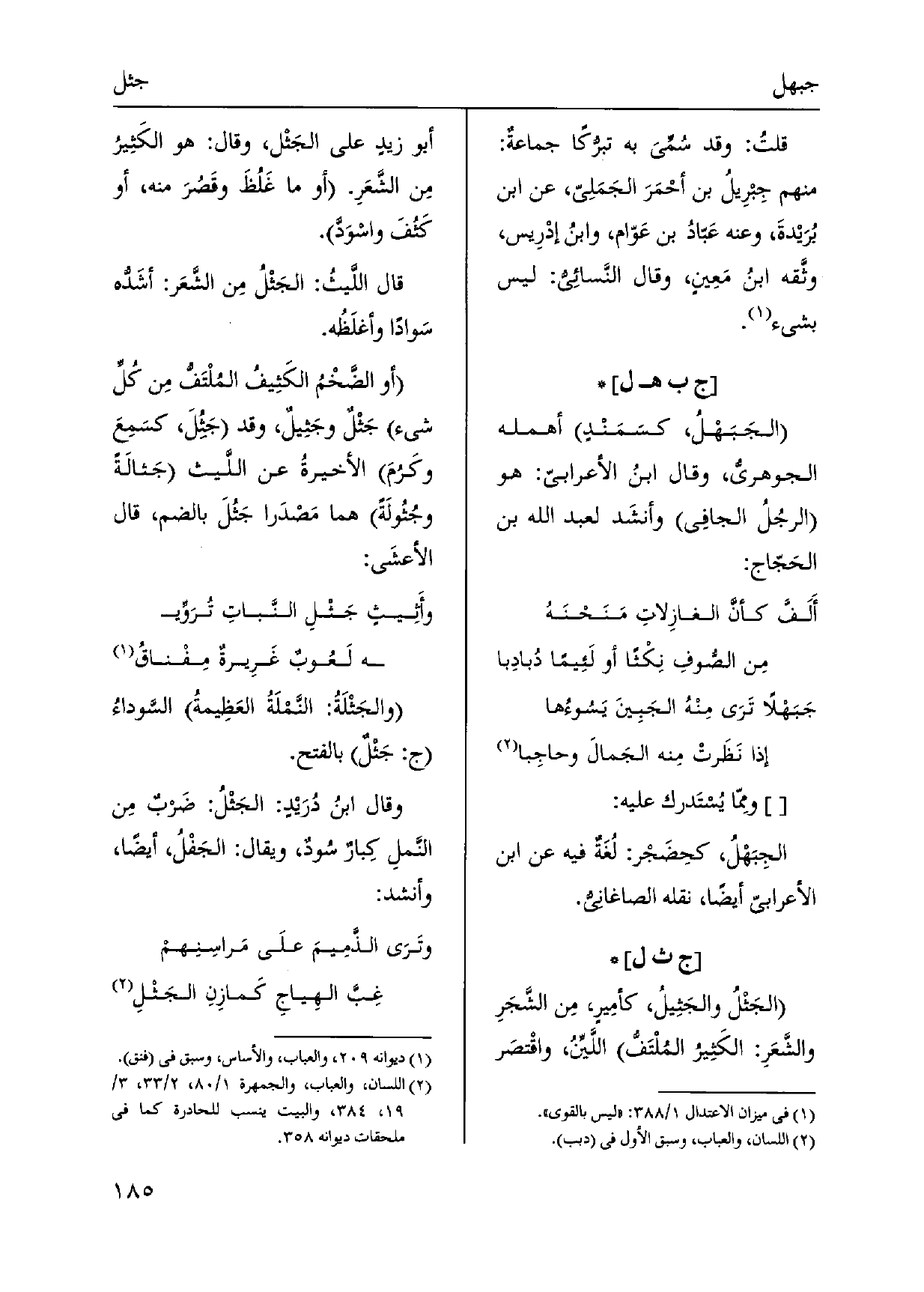 الجَثْل والجَثِيلُ، كأمِيرٍ، مِن الشَّجَرِ والشَّعَرِ: الكَثِيرُ المُلْتَفُّ اللَّين، واقْتصَر أَبُو زيدٍ على الجَثْل، وَقَالَ: هُوَ الكَثِيرُ مِن الشَّعَرِ. أَو مَا غَلُظَ وقَصُرَ مِنْهُ، أَو كَثُفَ واسْوَدَّ. قَالَ اللَّيثُ: الجَثْلُ مِن الشَّعَر: أشَدُّه سَواداً وأغلَظُه. أَو الضَّخْمُ الكَثِيفُ المُلْتَف مِن كُلِّ شَيْء جَثْلٌ وجَثِيلٌ، وَقد جَثُلَ، كسَمِعَ وكَرُمَ الأخيرةُ عَن اللَّيث جَثالَةً وجُثُولَةً هما مَصْدَرا جَثُلَ بِالضَّمِّ، قَالَ الأعشَى: