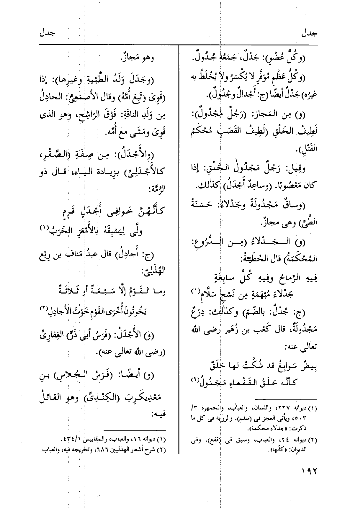 وكُل عُضْوٍ: جَدْلٌ، جَمْعُه جُدُول. وكُلُّ عَظْمٍ مُوَفَّرٍ لَا يُكْسَرُ وَلَا يُخْلَطُ بِهِ غيرُه جَدْلٌ أَيْضا ج: أَجْدالٌ وجُدُولٌ. مِن المَجاز: رَجُلٌ مَجْدُولٌ: لَطِيفُ الخَلْقِ لَطِيفُ القَصَبِ مُحْكَمُ الفَتْلِ. وقِيل: رَجُلٌ مَجْدُولُ الخَلْقِ: إِذا كَانَ مَعْصُوباً. وساعِدٌ أَجْدَلُ كَذَلِك. وساقٌ مَجْدُولَةٌ وجَدْلاءُ: حَسَنَةُ الطَّيِّ وَهِي مجازٌ.