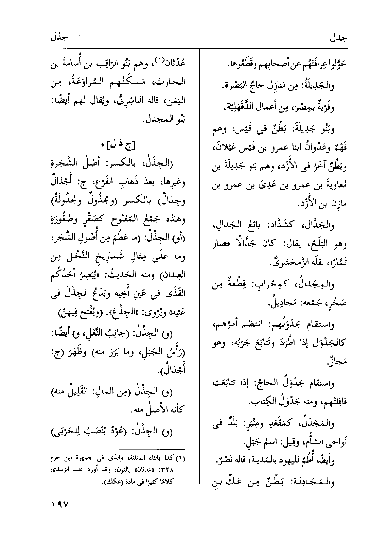 حَوَّلوا عِرافَتَهُم عَن أصحابِهم وقَطَعُوها. والجَدِيلَةُ: مِن مَنازِل حاجِّ البَصْرة. وقَريةٌ بمِصْرَ، مِن أَعمال الدَّقَهْلِيَّة. وبَنُو جَدِيلَةَ: بَطْنٌ فِي قَيس، وهم فَهْمٌ وعَدْوانُ ابْنا عَمْرو بن قَيس عَيلانَ، وبَطْنٌ آخَرُ فِي الأَزْد، وهم بَنو جَدِيلَةَ بن مُعاويةَ بن عَمْرو بن عَدِيّ بن عَمْرو بن مازِن بن الأَزْد. والجَدَّال، كشَدَّاد: بائعُ الجَدالِ، وَهُوَ البَلَحُ، يُقَال: كَانَ جَدَّالاً فَصَارَ تَمَّاراً، نقلَه الزَّمخشريُّ. والمِجْدالُ، كمِحْرابٍ: قِطْعةٌ مِن صَخْرٍ، جَمْعه: مَجادِيلُ. واستقام جَدْوَلُهم: انتظم أمرُهم، كالجَدْوَل إِذا اطَّرَدَ وتَتابَعَ جَرْيُه، وَهُوَ مَجازٌ. واستقام جَدْوَلُ الحاجِّ: إِذا تتابَعَت قافِلتُهم، وَمِنْه جَدْوَلُ الكِتاب. والمَجْدَلُ، كمَقْعَدٍ ومِنْبَرٍ: بَلَدٌ فِي نَواحي الشأْم، وقِيل: اسمُ جَبَلٍ. وَأَيْضًا أُطُمٌ للْيَهُود بالمَدينة، قَالَه نَصْرٌ.)