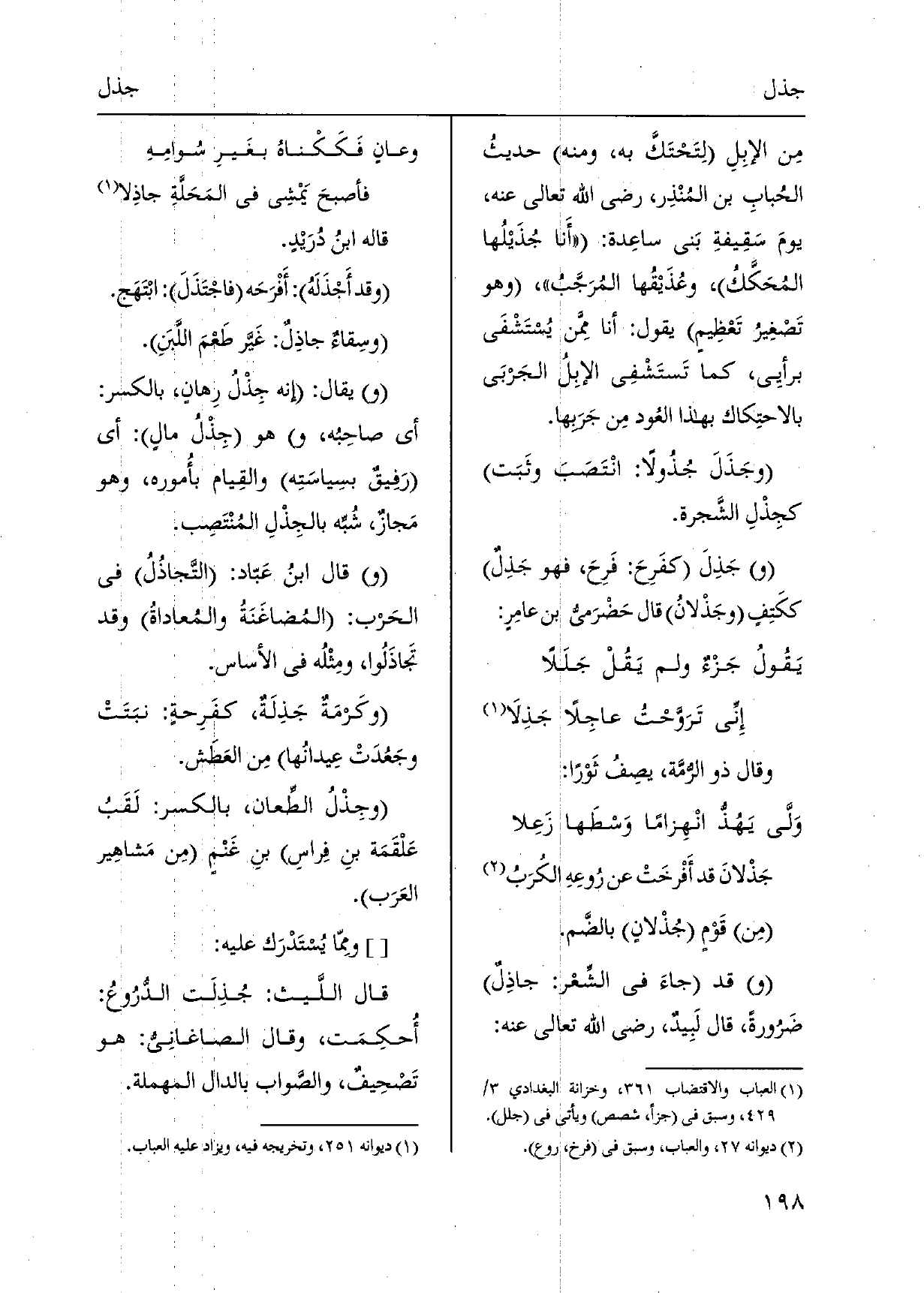 مِن الإبِلِ لِتَحْتكَّ بِهِ، وَمِنْه حديثُ الحُبابِ بن المُنْذِر، رَضِي الله تَعَالَى عَنهُ، يومَ سَقِيفةِ بني ساعِدة: أَنا جُذَيْلُها المُحَكَّكُ، وعُذَيْقُها المُرَجُّبُ، وَهُوَ تَصْغِيرُ تَعْظِيمٍ يَقُول: أَنا مِمَّن يُشتَشْفَى برأيِي، كَمَا تَستَشْفِي الإبِلُ الجَربَى بالاحتِكاك بِهَذَا العُود مِن جَرَبها. وجَذَلَ جُذولاً: انْتَصَبَ وثَبَتَ كجِذْلِ الشَّجرة. جَذِلَ كفَرِحَ: فَرِحَ، فَهُوَ جَذِلٌ ككَتِفٍ وجَذْلانُ قَالَ حَضْرَميُّ بن عامِرٍ: