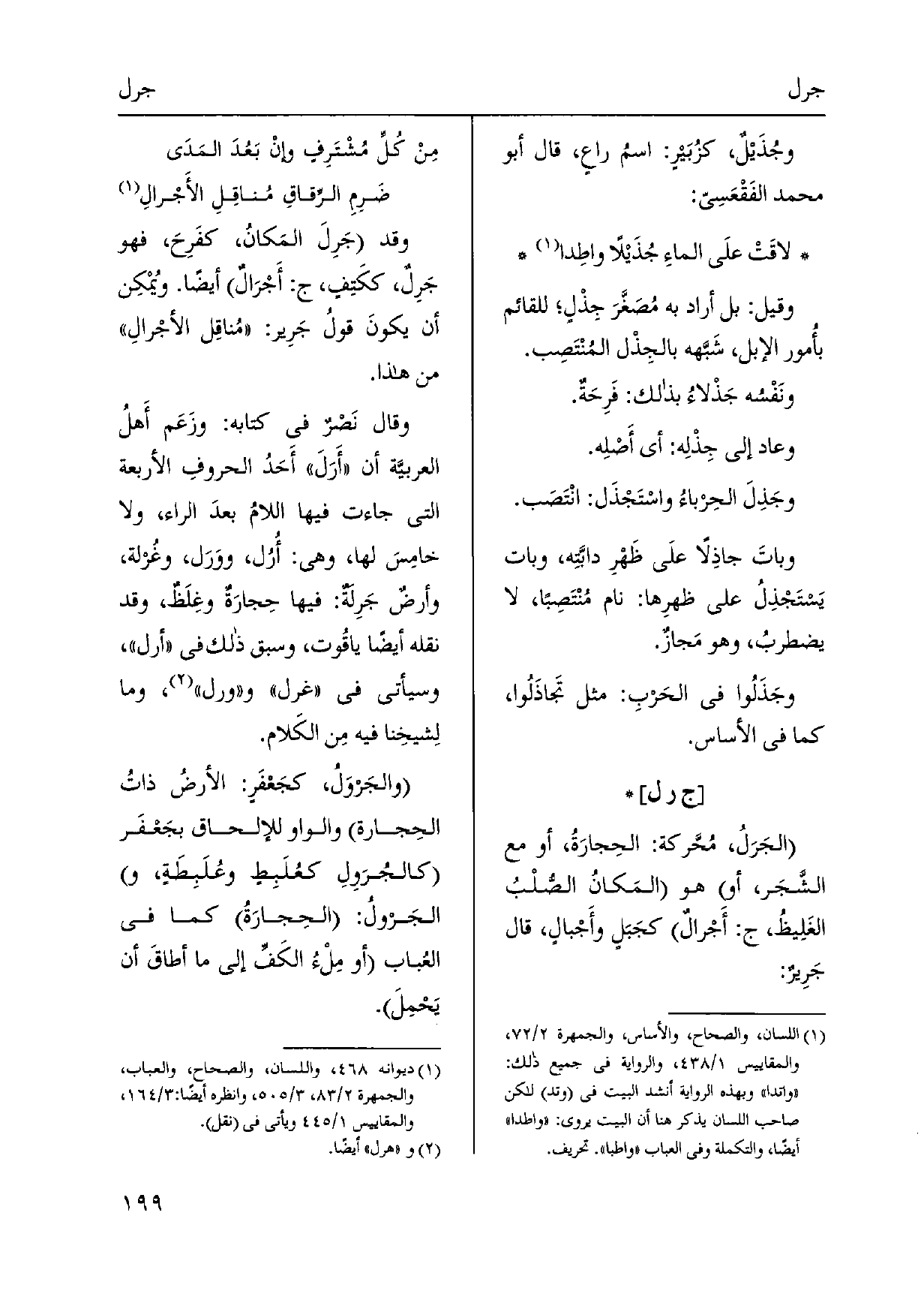 وَقد جَرِلَ المَكانُ، كفَرِحَ، فَهُوَ جَرِلٌ، ككَتِفٍ، ج: أَجْرَالٌ أَيْضا. وُيمْكِن أَن يكونَ قولُ جَرِير: مُناقِل الأجْرالِ من هَذَا. وَقَالَ نَصْرٌ فِي كِتَابه: وزَعَم أَهلُ العربيَّة أَن أَرَلَ أَحَدُ الحروفِ الْأَرْبَعَة الَّتِي جَاءَت فِيهَا اللامُ بعدَ الرَّاء، وَلَا خامِسَ لَهَا، وَهِي: أُرُل، ووَرَل، وغُرْلة، وأرضٌ جَرِلَةٌ: فِيهَا حِجارَةٌ وغِلَظٌ، وَقد نَقله أَيْضا ياقُوت، وَسبق ذَلِك فِي أرل، وَسَيَأْتِي فِي غرل ورل، وَمَا لِشيخِنا فِيهِ مِن الكَلام. والجَرْوَلُ، كجَعْفَرٍ: الأَرْض ذاتُ الحِجارة وَالْوَاو للإلحاق بجَعْفَر كالجُرَوِلِ كعُلَبِطٍ وعُلَبِطَةٍ، الجَرْولُ: الحِجارَةُ كَمَا فِي العُباب أَو مِلْءُ الكَفِّ إِلَى مَا أطاقَ أَن يَحْمِلَ.