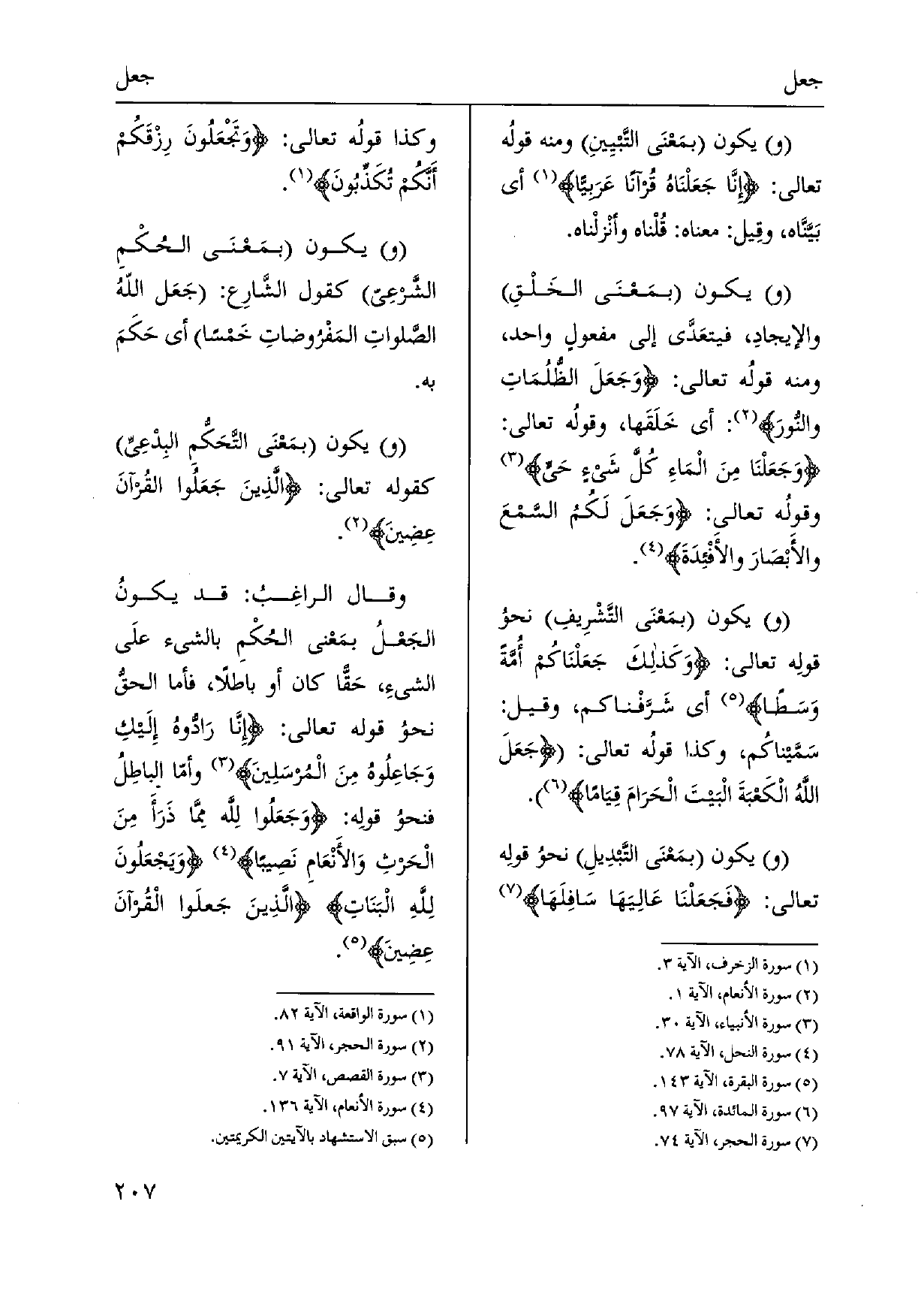 يكون بمَعْنَى التَّبيِينِ وَمِنْه قولُه تَعَالَى: إِنَّا جَعَلْنَاهُ قُرآناً عَرَبيّاً أَي بَيَّنَّاه، وقِيل: مَعْنَاهُ: قُلْناه وأنْزلْناه. يكون بمَعْنَى الخَلْقِ والإيجادِ، فيتعَدَّى إِلَى مفعولٍ وَاحِد، وَمِنْه قولُه تَعَالَى: وَجَعَلَ الظُّلُمَاتِ والنُّورَ: أَي خَلَقَها، وقولُه تَعَالَى: وَجَعَلْنَا مِنَ الْمَاءِ كُلَّ شَيءٍ حَيٍّ وقولُه تَعَالَى: وَجَعَلَ لَكُمُ السَّمْعَ والأَبْصَارَ والأَفْئِدَةَ. يكون بمَعْنَى التَّشْرِيفِ نحوُ قولِه تَعَالَى: وَكَذلكَ جَعَلْنَاكُم أُمَّةً وَسَطاً أَي شَرَّفْناكم، وَقيل: سَّمّيناكُم، وَكَذَا قولُه تَعَالَى: جَعَلَ اللَّهُ الْكَعْبَةَ الْبَيتَ الْحَرَامَ قِيَاماً. يكون بمَعْنَى التَّبدِيلِ نحوُ قولِه تَعَالَى: فَجَعَلْنَا عَالِيَهَا سَافِلَهَا وَكَذَا قولُه تَعَالَى: وَتَجْعَلُونَ) رِزْقَكُم أَنَّكُم تُكَذِّبُونَ. يكون بمَعْنَى الحُكْمِ الشَّرعِيّ كَقَوْل الشَّارِع: جَعَل اللهُ الصَّلواتِ المَفْرُوضاتِ خَمْساً أَي حَكَمَ بِهِ. يكون بمَعْنَى التَّحَكُّمِ البِدْعِيِّ كَقَوْلِه تَعَالَى: الَّذِينَ جَعَلُوا القُرآنَ عِضِينَ. وَقَالَ الراغِبُ: قد يكونُ الجَعْلُ بمَعْنى الحُكْمِ بالشَّيْء علَى الشَّيْء، حَقّاً كَانَ أَو بَاطِلا، فَأَما الحقُّ نحوُ قَوْله تَعَالَى: إِنَّا رَادُّوهُ إِلَيكِ وَجَاعِلُوهُ مِنَ الْمُرسَلِينَ وأمّا الباطِلُ فنحوُ قولِه: وَجَعَلُوا لِلَّه مِمَّا ذَرَأَ مِنَ الْحَرثِ وَالأَنْعَامِ نَصِيباً وَيَجْعَلُونَ لِلَّهِ الْبَنَاتِ الَّذِينَ جَعلَوا الْقُرآنَ عِضِينَ.