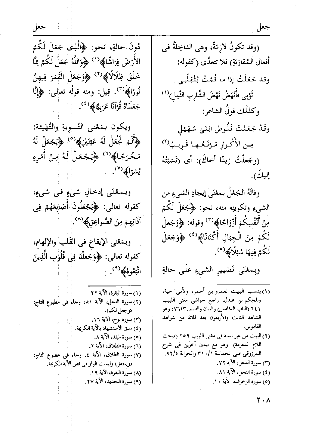 وجَعلْتُ زيدا أخاكَ: أَي نَسَبْتُهُ إليكَ. وفاتَهُ الجَعْلُ بمعْنَى إيجادِ الشَّيْء من الشَّيْء وتكوينه مِنْهُ، نَحْو: جَعَلَ لَكُم مِنْ أَنْفُسِكُم أَزْوَاجاً وَقَوله: وَجَعلَ لَكُم مِنَ الْجِبَالِ أَكْنَاناً وَجَعَلَ لَكُم فِيهَا سُبُلاً. وبمعْنَى تَصْييرِ الشَّيْء علَى حالةٍ دُونَ حالةٍ، نَحْو: الَّذِي جَعَلَ لَكُمُ الأَرْضَ فِرَاشاً وَاللَّهُ جَعَلَ لَكُم مِمَّا خَلَقَ ظِلَالاً وَجَعَلَ الْقَمَرَ فِيهِنَّ نُوراً. قِيل: وَمِنْه قولُه تَعَالَى: إِنَّا جَعَلْنَاهُ قُرآناً عَرَبِيّاً. وَيكون بمَعْنى التَّسوِيةِ والتَّهْيئة: أَلَم نَجْعَلْ لَهُ عَينَيْنِ يَجْعَلْ لَهُ مَخْرَجاً يَجْعَلْ لَهُ مِنْ أَمْرِهِ يُسْراً. وبمعْنَى إدخالِ شيءٍ فِي شيءٍ، كَقَوْلِه تَعَالَى: يَجْعَلُونَ أَصَابِعَهُم فِي آذَانِهِم مِنَ الصَّواعِقِ. وبمَعْنى الإيقاعِ فِي القَلب والإلهامِ، كَقَوْلِه تَعَالَى: وَجَعلْنَا فِي قُلُوبِ الَّذِينَ اتَّبَعُوهُ.
