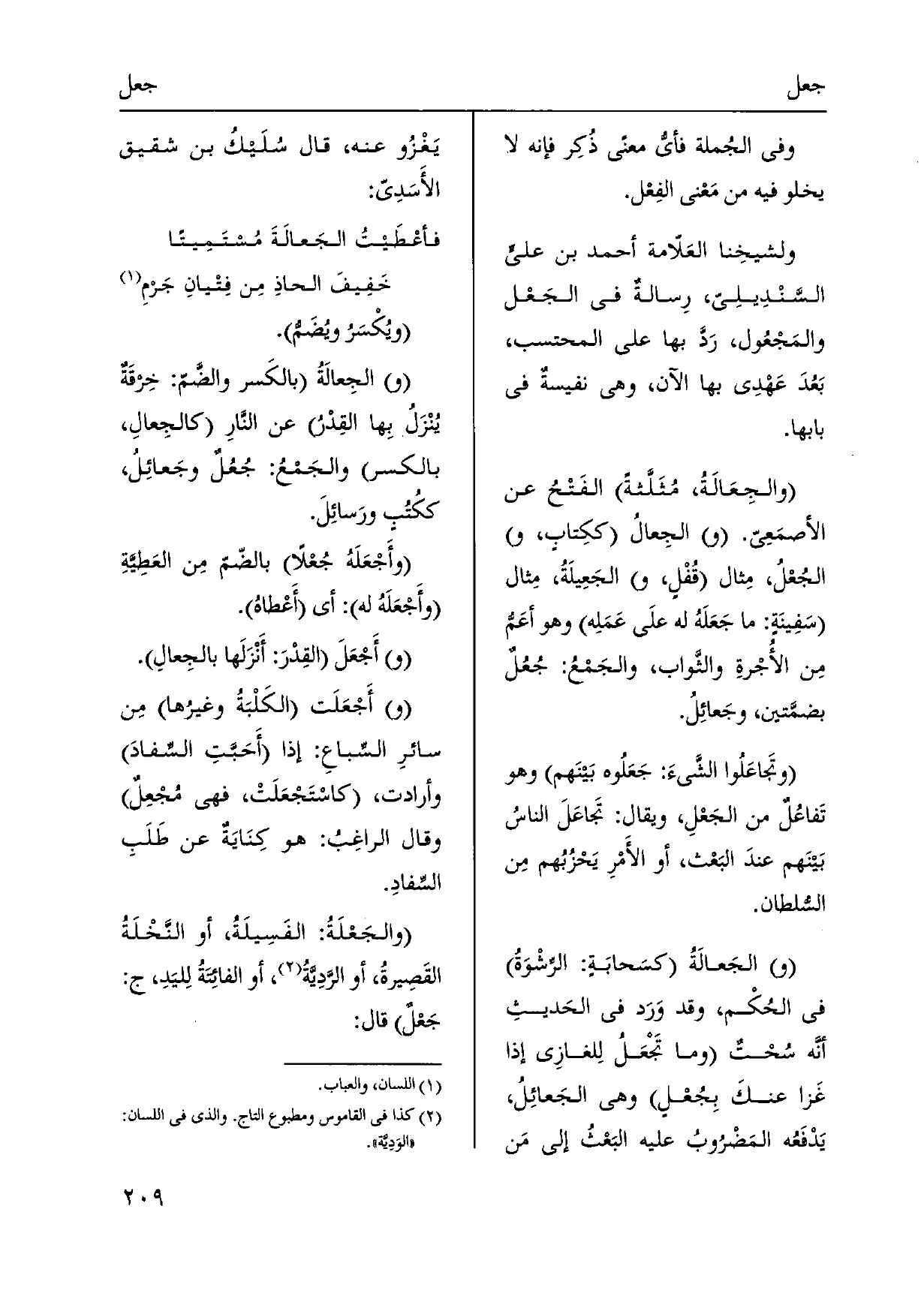 وَفِي الجُملة فَأَي معنى ذُكِر فَإِنَّهُ لَا يَخْلُو فِيهِ من مَعْنى الفِعْل. ولشيخِنا العَلّامة أَحْمد بن عليٍّ السَّنْدِيلِيّ، رِسالةٌ فِي الجَعْل والمَجْعُول، رَدَّ بهَا على الْمُحْتَسب، بَعُدَ عَهْدِي بهَا الْآن، وَهِي نفيسةٌ فِي بَابهَا. والجِعَالَةُ، مُثَلَّثةً الفَتْحُ عَن الأصمَعِي. الجِعالُ ككِتابٍ، الجُعْلُ، مِثال قُفْلٍ، الجَعِيلَةُ، مِثال سَفِينَةٍ: مَا جَعَلَهُ لَهُ علَى عَمَلِه وَهُوَ أعَمُّ مِن الأُجْرةِ والثَّواب، والجَمْعُ: جُعُلٌ بضمَّتين، وجَعائِلُ. وتَجاعَلُوا الشَّيْء: جَعَلُوه بَينَهم وَهُوَ تَفاعُلٌ من الجَعْلِ، وَيُقَال: تَجاعَلَ الناسُ بَينَهم عندَ البَعْث، أَو الأَمْرِ يَحْزُبُهم مِن السّلطان. الجَعالَةُ كسَحابَةٍ: الرَّشْوَةُ فِي الحُكْم، وَقد وَرَد فِي الحَديثِ أنَّه سُحْتٌ وَمَا تَجْعَلُ لِلغازِي إِذا غَزا عنكَ بِجُعْلٍ وَهِي الجَعائِلُ، يَدْفَعُه المَضْرُوبُ عَلَيْهِ البَعْثُ إِلَى مَن يَغْزُو عَنهُ، قَالَ سُلَيكُ بن شَقِيق الأَسَدِيّ: