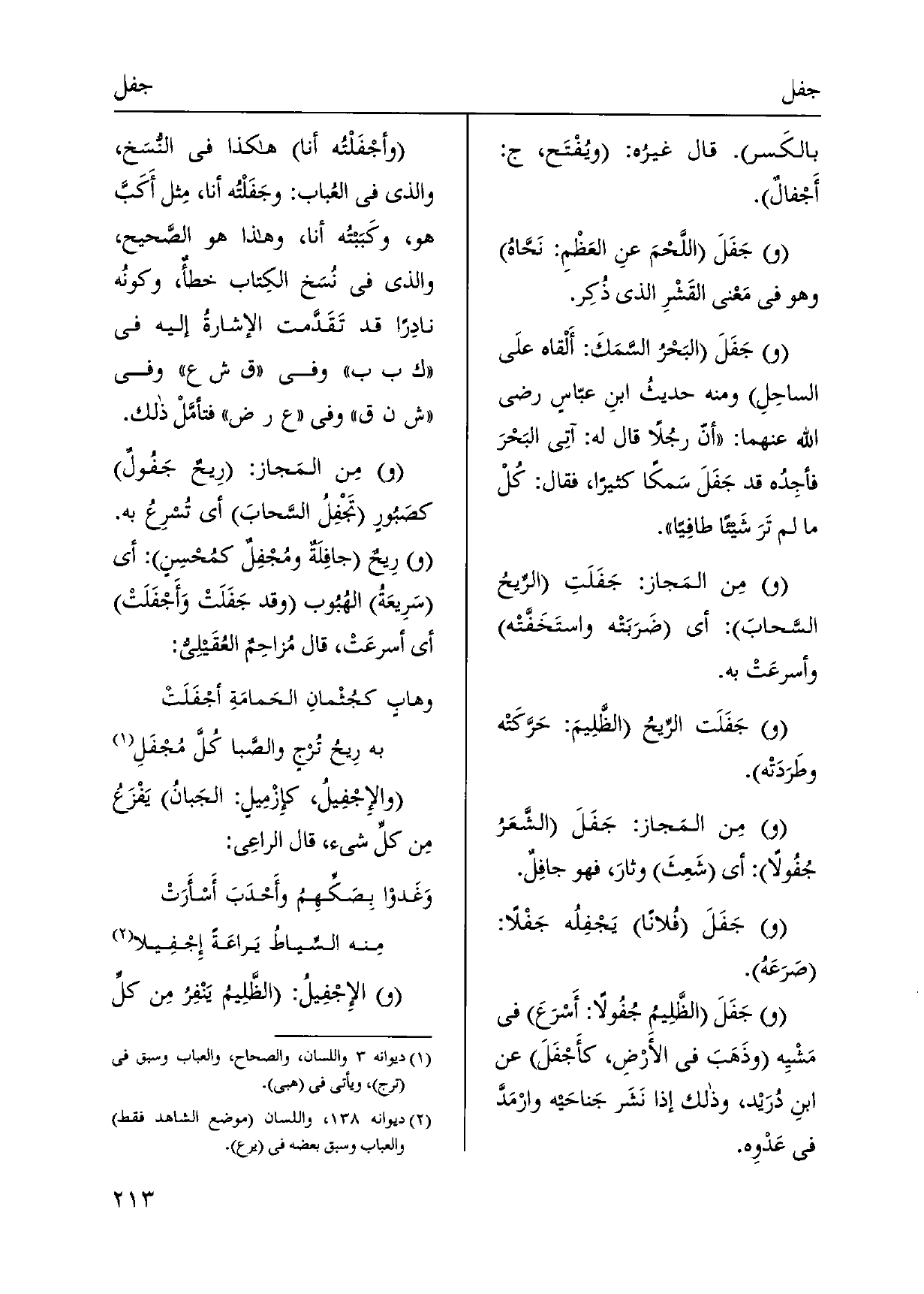 بالكَسر. قَالَ غَيره: وَيفتح، ج: أَجْفالٌ. جَفَلَ اللَّحْمَ عنِ العَظْمِ: نَحَّاهُ وَهُوَ فِي مَعْنى القَشْرِ الَّذِي ذُكِر. جَفَلَ البَحْرُ السَّمَكَ: أَلْقاه علَى الساحِلِ وَمِنْه حديثُ ابنِ عبّاسٍ رَضِي الله عَنْهُمَا: أنّ رجُلاً قَالَ لَهُ: آتِى البَحْرَ فأجِدُه قد جَفَلَ سَمكاً كثيرا، فَقَالَ: كلْ مَا لم تَرَ شَيئاً طافِياً. مِن المَجاز: جَفَلَتِ الرِّيحُ السَّحابَ: أَي ضَرَبَتْه واستَخَفَّتْه وأسرعَتْ بِهِ. جَفَلَت الرِّيحُ الظَّلِيمَ: حَرَّكَتْه وطَرَدَتْه. مِن المَجاز: جَفَلَ الشَّعَرُ جُفُولاً: أَي شَعِثَ وثارَ، فَهُوَ جافِلٌ. جَفَلَ فُلاناً يَجْفِلُه جَفْلاً: صَرَعَهُ. جَفَلَ الظَّلِيمُ جُفُولاً: أَسْرَعَ فِي مَشْيِه وذَهَبَ فِي الأرْضِ، كأَجْفَلَ عَن ابنِ دُرَيْد، وَذَلِكَ إِذا نَشَر جَناحَيْه وارْمَدَّ فِي عَدْوِه.