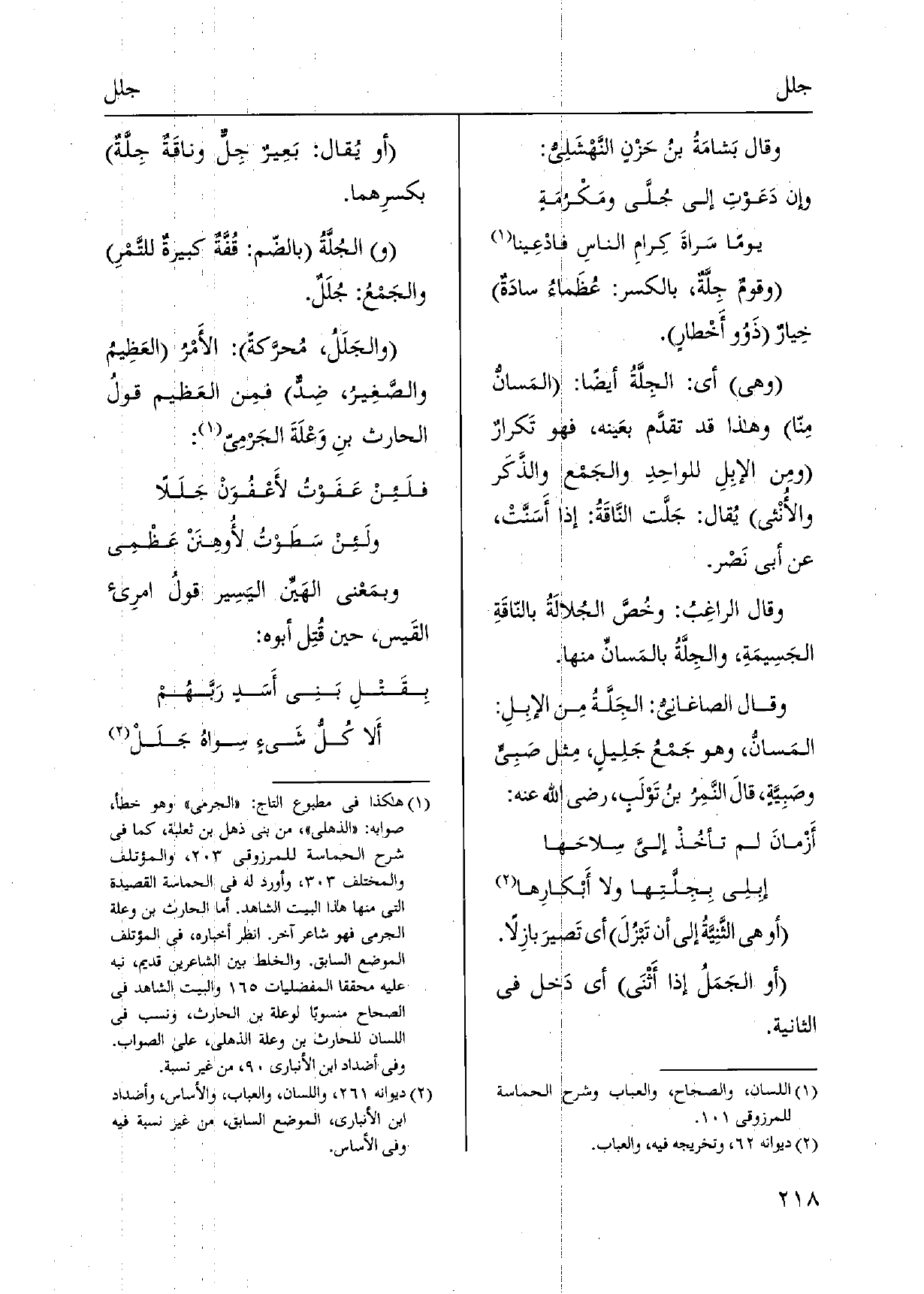 أَو هِيَ الثَّنِيَّةُ إِلَى أَن تَبْزُلَ أَي تَصيرَ بازِلاً. أَو الجَمَلُ إِذا أَثْنَى أَي دَخل فِي الثَّانِيَة. أَو يُقال: بَعِيرٌ} جِلٌّ وناقَةٌ {جِلّةٌ بكسرِهما. (و) } الجُلَّةُ بالضّم: قُفَّةٌ كبيرةٌ للتَّمْرِ والجَمْعُ: {جُلَلٌ.} والجَلَلُ، مُحرَّكةً: الأَمْرُ العَظِيمُ والصَّغِيرُ، ضِدٌّ فمِن العَظيم قولُ الْحَارِث بنِ وَعْلَةَ الجَرْمِي:
