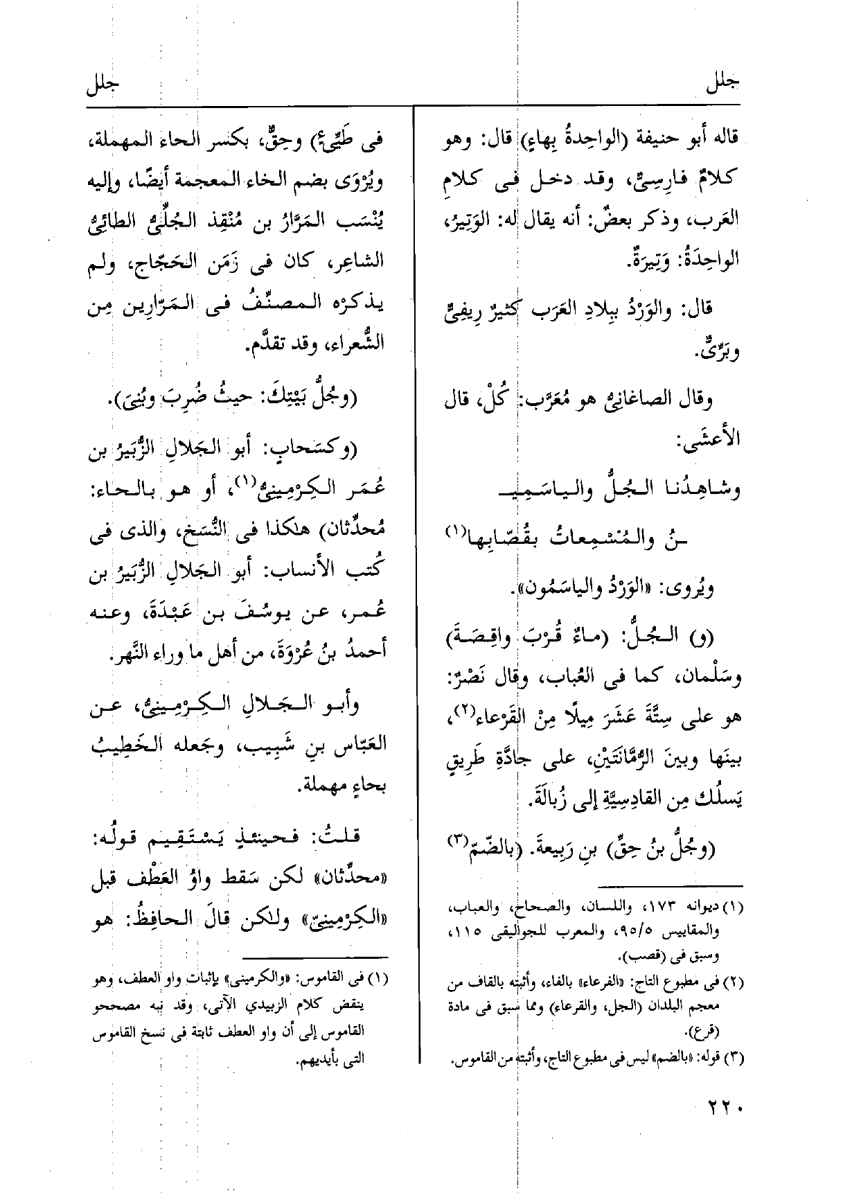 الحَجّاج، وَلم يذكرهُ المصنِّفُ فِي المَرّارِين مِن الشُّعراء، وَقد تقدَّم. {وجُلُّ بَيْتِكَ: حَيْثُ ضُرِبَ وبُنِيَ. وكسَحابٍ: أَبُو} الجَلالِ الزُّبَيرُ بن عُمَر الكِرْمِينيُّ، أَو هُوَ بِالْحَاء: مُحدِّثان هَكَذَا فِي النُّسَخ، وَالَّذِي فِي كُتب الْأَنْسَاب: أَبُو الجَلالِ الزُّبَيرُ بن عُمر، عَن يوسُفَ بن عَبدَةَ، وَعنهُ أحمدُ بنُ عُروَةَ، من أهل مَا وَرَاء النَّهر. وَأَبُو الجَلالِ الكِرمِينيُّ، عَن العَبّاس بنِ شَبِيب، وجَعله الخَطِيبُ بحاءٍ مُهْملَة. قلتُ: فحينئذٍ يَستَقِيم قولُه: محدِّثان لَكِن سَقط واوُ العَطْف قبل الكِرمِينيّ وَلَكِن قالَ الحافِظُ: هُوَ