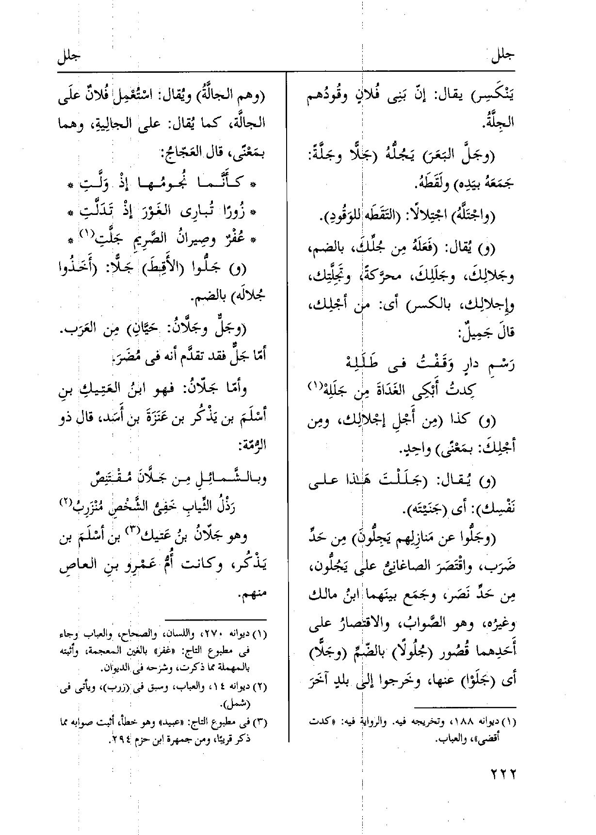 كَذَا مِن أَجْلِ} إجْلالِك، ومِن أجْلِكَ: بمَعْنًى واحِدٍ. يُقال: جَلَلْتَ هَذا على نَفْسِك: أَي جَنَيتَه. {وجَلُّوا عَن مَنازِلِهم} يَجِلُّونَ مِن حَدِّ ضَرَب، واقْتَصَرَ الصَّاغَانِي على يَجُلُّون، مِن حَدِّ نَصَر، وجَمَع بينَهما ابنُ مَالك وَغَيره، وَهُوَ الصَّوابُ، والاقتصارُ على أَحَدِهما قُصُور {جُلُولاً بالضّمِّ} وجَلّاً أَي جَلَوْا عَنْهَا، وخَرجوا إِلَى بلدٍ آخَرَ وهم {الجالَّةُ ويُقال: اسْتُعْمِل فُلانٌ علَى} الجالَّة، كَمَا يُقال: على الجالِيةِ، وهما بمَعْنًى، قَالَ العَجّاجُ: كأنَّما نُجومُها إذْ وَلَّتِ زُوراً تُبارِى الغَوْرَ إذْ تَدَلَّتِ عُفْرٌ وصِيرانُ الصَّرِيمِ {جَلَّتِ (و) } جَلُّوا الأَقِطَ {جَلّاً: أَخَذُوا} جُلالَه بِالضَّمِّ. {وجَلٌّ} وجَلَّانُ: حَيَّانِ مِن العَرَب. أمّا {جَلٌّ فقد تقدَّم أَنه فِي مُضَرَ. وأمّا} جَلّانُ: فَهُوَ ابنُ العَتِيكِ بنِ أسْلَمَ بن يَذْكر بن عَنَزَةَ بن أَسَد، قَالَ ذُو الرُّمة: