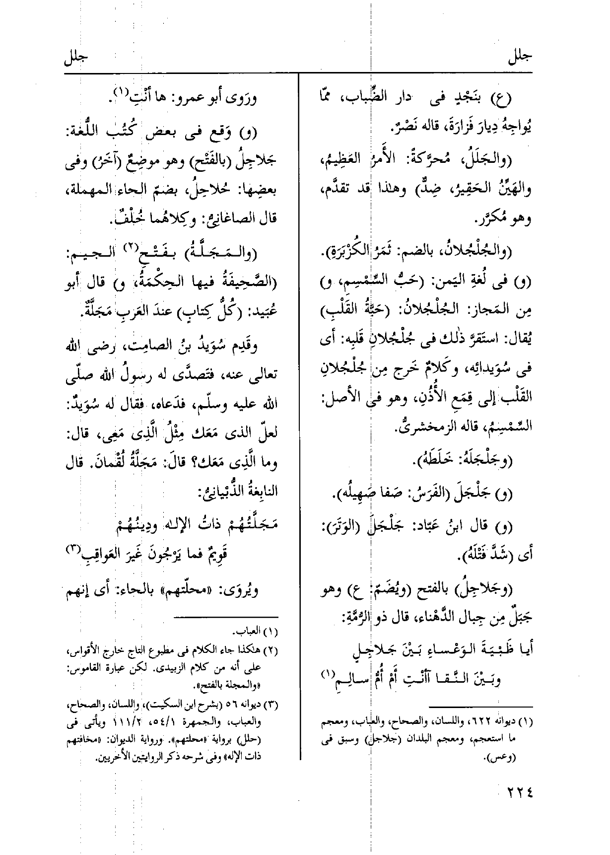 ورَوى أَبُو عَمْرو: هَا أنْتِ. وَقع فِي بعض كُتُب اللُّغة: {جَلاجِلُ بالفَتْح وَهُوَ موضِعٌ آخَرُ وَفِي بعضِها: حُلاحِل، بضمّ الْحَاء الْمُهْملَة، قَالَ الصَّاغَانِي: وكِلاهُما خُلْفٌ.} والمَجَلَّةُ بفَتْحِ الْجِيم: الصَّحِيفَةُ فِيهَا الحِكْمَةُ، قَالَ أَبُو عُبَيد: كُل كِتابٍ عندَ العَربِ مَجَلَّةٌ. وقَدِم سُوَيدُ بنُ الصَّامِت، رَضِي الله تَعَالَى عَنهُ، فتَصدَّى لَهُ رسولُ الله صلّى الله عَلَيْهِ وسلّم، فدَعاه، فَقَالَ لَهُ سُوَيدٌ: لعلّ الَّذِي مَعَك مِثْلُ الَّذِي مَعِي، قَالَ: وَمَا الَّذِي مَعَك قالَ: مَجَلَّةُ لُقْمانَ. قَالَ النابِغةُ الذُّبيانيُّ: