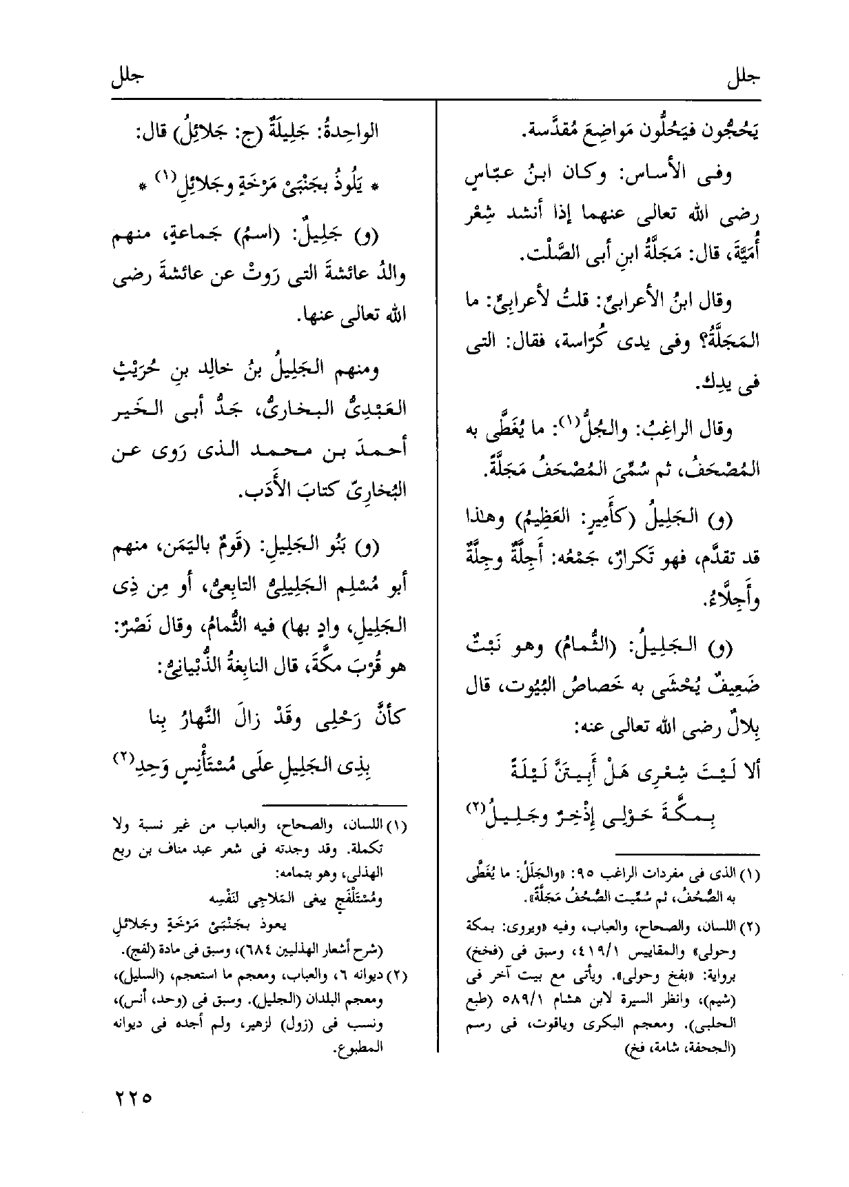 يَحُجُّون فيَحُلُّون مَواضِعَ مُقَدّسة. وَفِي الأساس: وَكَانَ ابنُ عبّاسٍ رَضِي الله تَعَالَى عَنْهُمَا إِذا أنْشد شِعْر أمَيَّةَ، قَالَ: {مَجَلَّةُ ابنِ أبي الصَّلْت. وَقَالَ ابنُ الْأَعرَابِي: قلتُ لأعرابِيٍّ: مَا} المَجَلَّةُ وَفِي يَدي كُرّاسة، فَقَالَ: الَّتِي فِي يدِك. وَقَالَ الراغِبُ: {والجُلُّ: مَا يُغَطَّى بِهِ المُصْحَفُ، ثمَّ سُمِّيَ المُصْحَفُ مَجَلَّةً. الجَلِيلُ كأَمِيرٍ: العَظِيمُ وَهَذَا قد تقَدّم، فَهُوَ تَكرارٌ، جَمْعُه:} أَجِلَّةٌ {وجِلَّةٌ} وأَجِلَاءُ. (و) {الجَلِيلُ: الثُّمامُ وَهُوَ نَبتٌ ضَعِيفٌ يُحْشَى بِهِ خَصاصُ البُيُوت، قَالَ بِلالٌ رَضِي الله تَعَالَى عَنهُ: