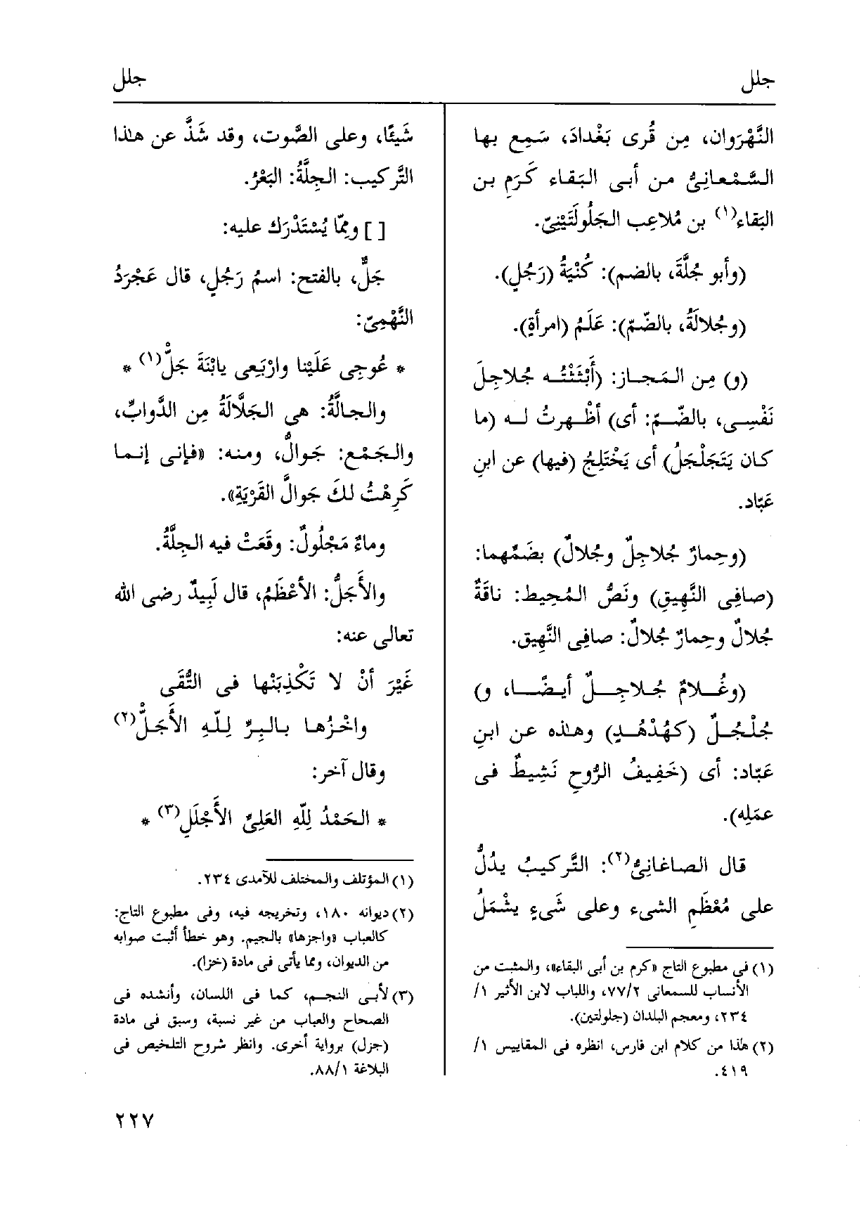 النَّهْرَوان، مِن قُرى بَغْدادَ، سَمِع بهَا السَّمْعانِيُّ من أبي البَقاء كَرَمِ بن البَقاء بن مُلاعِب {- الجَلولَتَينيّ. وَأَبُو} جُلَّةَ، بِالضَّمِّ: كُنْيَةُ رَجُلٍ. {وجُلالَةُ، بالضّمّ: عَلَمُ امرأةٍ. مِن المَجاز: أَبْثَثْتُه} جُلاجِلَ نَفْسِي، بالضّمّ: أَي أظْهرتُ لَهُ مَا كَانَ {يَتَجَلْجَلُ أَي يَخْتَلِجُ فِيهَا عَن ابنِ عَبّاد.