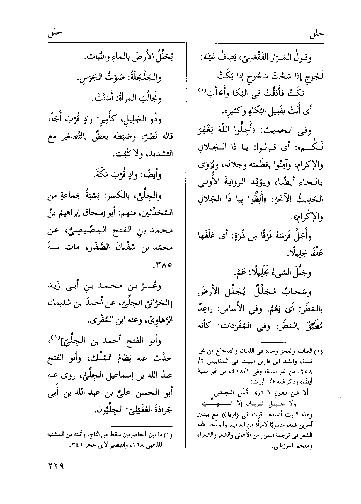أَي أَتَتْ بقَلِيل البكاءِ وكثيرِه. وَفِي الحَدِيث: {أَجِلّوا اللهَ يغْفر لَكُم: أَي قُولُوا: يَا ذَا الجَلالِ وَالْإِكْرَام، وآمِنُوا بعَظَمته وجَلاله، ويُروَى بِالْحَاء أَيْضا، ويؤيِّد الروايةَ الأولى الحَدِيثُ الآخَرُ: أَلِظوا بِيا ذَا} الجَلالِ والإكْرام. {وأَجَلَّ فَرَسَهُ فَرْقاً مِن ذُرَةٍ: أَي عَلَفَها عَلْفاً} جَلِيلاً. {وجَلَّلَ الشَّيْء} تَجْلِيلاً: عَمَّ. وسَحابٌ {مُجَلِّلٌ:} يُجَلِّل الأرضَ بالمَطَر: أَي يَعُمُّ. وَفِي الأساس: راعِدٌ مُطَبِّقٌ بالمَطَر، وَفِي المُفْرَدات: كَأَنَّهُ {يُجَلِّلُ الأرضَ بالماءِ والنَّبات.} والجَلْجَلَةُ: صَوْتُ الجَرَسِ. {وتَجالَّتِ المرأةُ: أَسَنَّتْ. وذُو} الجَلِيلِ، كأَمِيرٍ: وادٍ قُرْبَ أَجَأ، قَالَه نَصْرٌ، وضبَطه بعضٌ بالتَّصغير مَعَ التَّشْدِيد، وَلَا يَثْبُت. وَأَيْضًا: وادٍ قُربَ مَكّةَ. {- والجِلِّيُّ، بِالْكَسْرِ: نِسبَةُ جَماعةٍ من المُحَدِّثين، مِنْهُم: أَبُو إِسْحَاق إبراهيمُ بنُ مُحَمَّد بنِ الْفَتْح المِصِّيصيُّ، عَن محمّد بن سُفْيانَ الصَّفّار، مَاتَ سنةَ. وعُمرُ بن مُحَمَّد بنِ أبي زَيد الحَرَّانيّ} - الجِلِّيّ، عَن أحمدَ بن سُليمان الرهاوِيّ، وَعنهُ ابْن المُقْري. وَأَبُو الْفَتْح أَحْمد بن الجِلِّيّ،، حدَّث عَنهُ نِظامُ المُلْك، وَأَبُو الْفَتْح عبدُ الله بن إِسْمَاعِيل الجِلِّيّ، روى عَنهُ أَبُو الْحسن عليّ بن عبد الله بن أبي جَرادَةَ العُقَيلِيّ:! الجِلِّيُّون.
