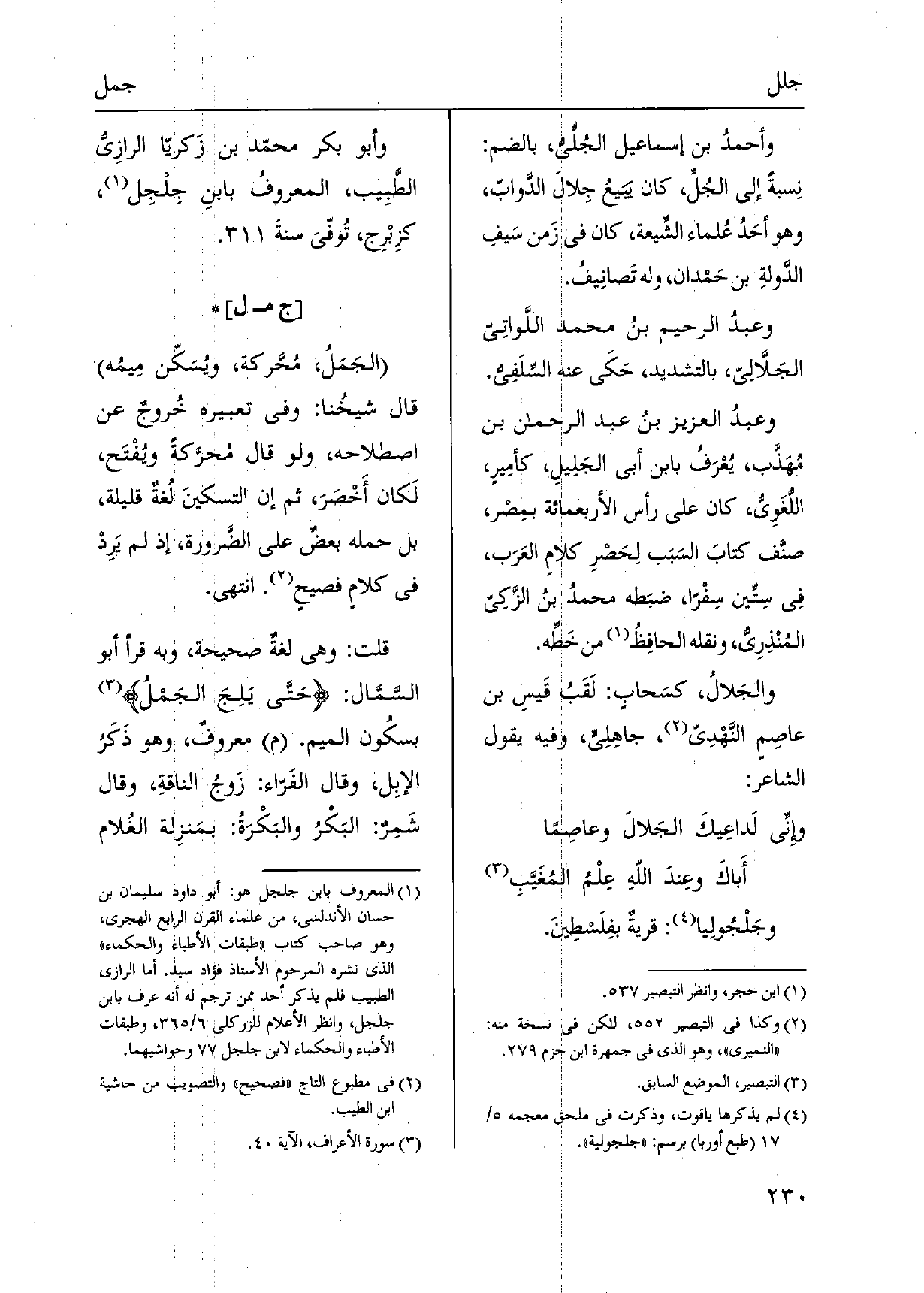 وأحمدُ بن إِسْمَاعِيل {- الجُلِّيُّ، بِالضَّمِّ: نِسبة إِلَى} الجُلِّ، كَانَ يَبَيعُ {جِلالَ الدَّوابّ، وَهُوَ أحَدُ عُلماء الشِّيعة، كَانَ فِي زَمن سَيفِ الدَّولةِ بن حَمْدان، وَله تَصانِيفُ. وعبدُ الرَّحِيم بنُ مُحَمَّد اللَّواتِيّ} - الجَلَّالِيّ، بِالتَّشْدِيدِ، حَكَى عَنهُ السلَفِيُّ. وعبدُ الْعَزِيز بنُ عبد الرَّحْمَن بن مُهَذَّب، يُعْوَفُ بِابْن أبي الجَلِيلِ، كأمِيرٍ، اللُّغَوِيُّ، كَانَ على رَأس الأربعمائة بمِصْر، صنَّف كتابَ السَبَب لِحَصْرِ كلامِ العَرَب، فِي سِتِّين سِفْراً، ضبَطه محمدُ بنُ الزَّكِيّ المُنْذِرِيُّ، وَنَقله الحافِظُ من خَطِّه. {والجَلالُ، كسَحابٍ: لَقَبُ قَيسِ بن عاصِمٍ النَّهْدِيّ، جاهِلِيٍّ، وَفِيه يَقُول الشَّاعِر: