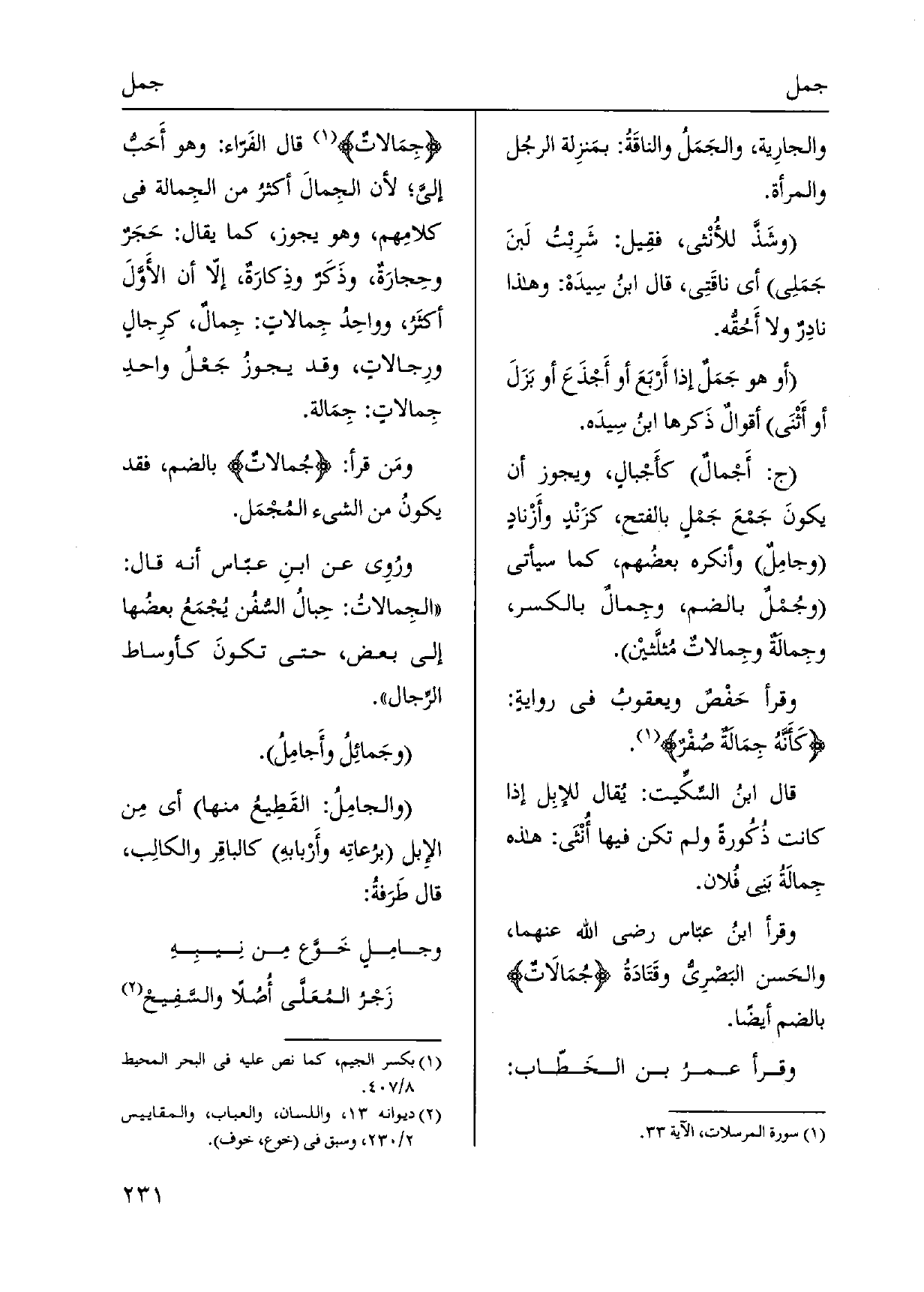 والجارِية، والجَمَلُ والناقَةُ: بمَنزِلة الرجُل وَالْمَرْأَة. وشَذَّ للأُنْثى، فقِيل: شَرِبْتُ لَبنَ جَمَلِي أَي ناقَتِي، قَالَ ابنُ سِيدَهْ: وَهَذَا نادِرٌ وَلَا أَحُقُّه. أَو هُوَ جَمَلٌ إِذا أَرْبَعَ أَو أَجْذَعَ أَو بَزَلَ أَو أَنْثَى أقوالٌ ذَكرها ابنُ سِيدَه. ج: أَجْمالٌ كأَجْبالٍ، وَيجوز أَن يكونَ جَمْعَ جَمْلٍ بِالْفَتْح، كزَنْدٍ وأَزْنادٍ وجامِلٌ وَأنْكرهُ بعضُهم، كَمَا سَيَأْتِي وجُمْلٌ بِالضَّمِّ، وجِمالٌ بِالْكَسْرِ، وجِمالة وجِمالاتٌ مُثلَّثيْن. وَقَرَأَ حَفْصٌ ويعقوبُ فِي روايةٍ: كَأنَّهُ جِمَالَةٌ صُفْرٌ. قَالَ ابنُ السِّكِّيت: يُقال للإبِل إِذا كَانَت ذُكُورةً وَلم تكن فِيهَا أُنْثَى: هَذِه جِمالَةُ بني فُلان. وَقَرَأَ ابنُ عبّاس رَضِي الله عَنْهُمَا، والحَسن البَصْريُّ وقَتَادَةُ جُمَالَاتٌ بِالضَّمِّ أَيْضا. وَقَرَأَ عمرُ بن الخَطّاب: جِمَالاتٌ قَالَ الفَرّاء: وَهُوَ أَحَبُّ إليَّ، لِأَن الجِمالَ أكثرُ من الجِمالة فِي كلامِهم، وَهُوَ يجوز، كَمَا يُقَال: حَجَرٌ وحِجارَةٌ، وذَكَرٌ وذِكارَةٌ، إِلَّا أَن الأَوَلَ أكثَرُ، وواحِدُ جِمالاتٍ: جِمالٌ، كرِجالٍ ورِجالاتٍ، وَقد يجوزُ جَعْلُ واحدِ جِمالاتٍ: جِمَالة. ومَن قَرَأَ: جُمالاتٌ بِالضَّمِّ، فقد يكونُ من الشَّيْء المُجْمَل.