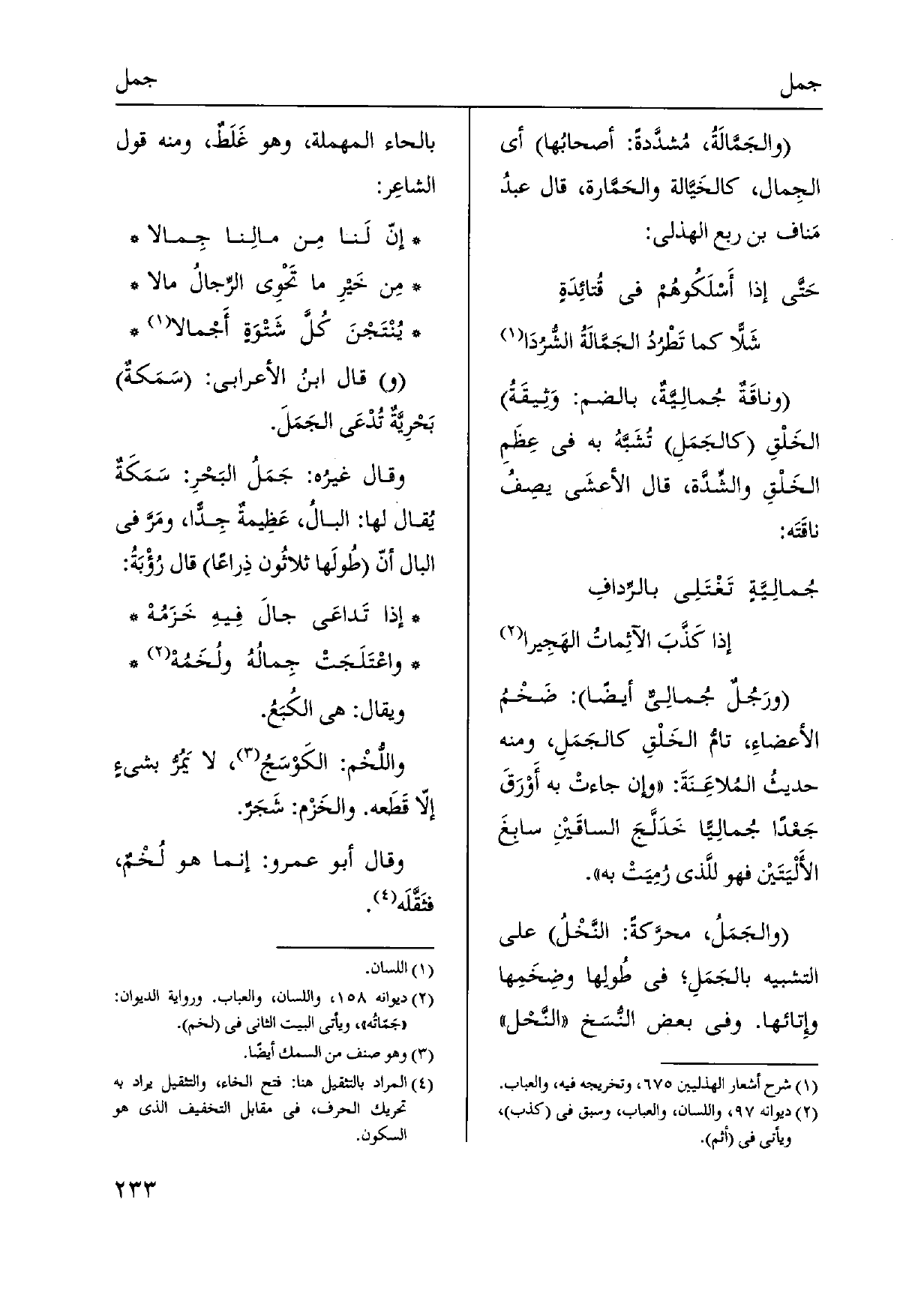 ورَجُلٌ جُمالِيٍّ أَيْضا: ضَخْمُ الأعضاءِ، تامُّ الخَلْقِ كالجَمَلِ، وَمِنْه حديثُ المُلاعَنَةَ: وَإِن جاءتْ بِهِ أَوْرَقَ جَعْداً جُمالِيّاً خَدَلَّجَ الساقَيْنِ سابغَ الأَلْيَتَيْن فَهُوَ للَّذي رُمِيَت بِهِ. والجَمَلُ، محرَّكةً: النَّخْلُ على التَّشْبِيه بالجَمَلِ فِي طُولِها وضِخَمِها وِإتائها. وَفِي بعض النُّسَخ النَّحْل بِالْحَاء الْمُهْملَة، وَهُوَ غَلَطٌ، وَمِنْه قَول الشاعِر: إنَّ لَنا مِن مالِنا جِمالا مِن خَيرِ مَا تَحْوِي الرِّجالُ مَالا يُنْتَجْنَ كُلَّ شَتْوَةٍ أَجْمالا قَالَ ابنُ الْأَعرَابِي: سَمَكةٌ بَحْرِيَّةٌ تُدْعَى الجَمَلَ. وَقَالَ غيرُه: جَمَلُ البَحْرِ: سَمَكَةٌ يُقال لَهَا: البالُ، عَظِيمةٌ جِدّاً، ومرَّ فِي البال أنّ طُولَها ثلاثُون ذِراعاً قَالَ رُؤْبَةُ: إِذا تَداعَى جالَ فِيهِ خَزَمُهْ)