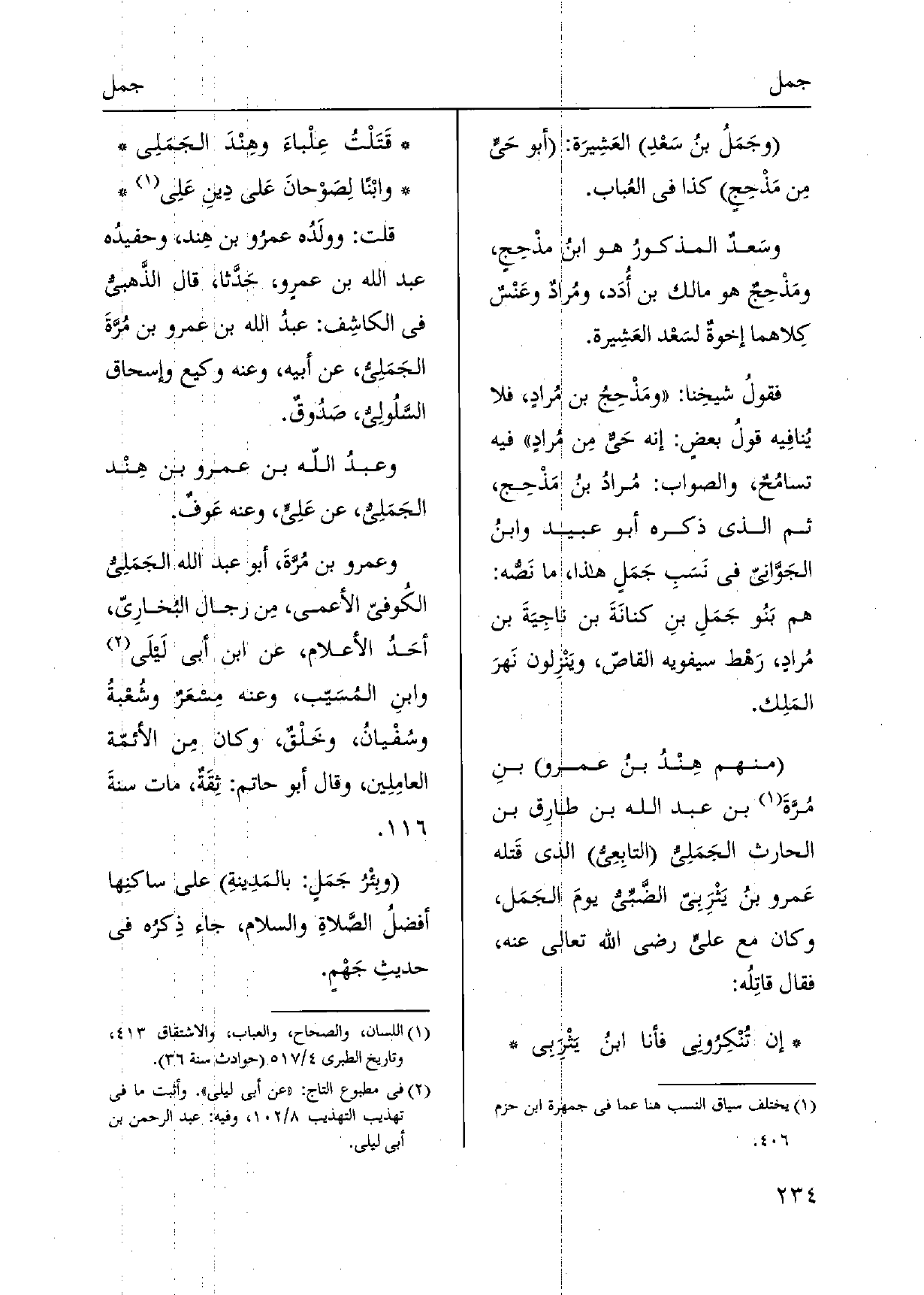 وجَمَلُ بنُ سَعْدِ العَشِيرَة: أَبُو حَيٍّ مِن مَذْحِجٍ كَذَا فِي العُباب. وسَعدٌ المذكورُ هُوَ ابنُ مذْحِجٍ، ومَذْحِجٌ هُوَ مَالك بن أُدَد، ومُرادٌ وعَنْسٌ كِلاهما إخوةٌ لسَعْد العَشِيرة. فقولُ شيخِنا: ومَذْحِجُ بن مُرادٍ، فَلَا يُنافِيه قولُ بعضٍ: إِنَّه حَيٌّ مِن مُرادٍ، فِيهِ تسامُحٌ، وَالصَّوَاب: مُرادُ بنُ مَذْحِج، ثمَّ الَّذِي ذكره أَبُو عبيد وابنُ الجَوَّانِيّ فِي نَسَبِ جَمَلٍ هَذَا، مَا نَصُّه: هم بَنُو جَمَلِ بنِ كنانَةَ بن ناجِيَةَ بن مُرادٍ، رَهْط سيفويه القاصّ، ويَنْزِلون نَهرَ المَلِك. مِنْهُم هِنْدُ بنُ عَمْرو بنِ مُرَّةَ بن عبد الله بن طارِق بن الْحَارِث الجَمَلِيُّ التابِعِيّ الَّذِي قَتله عَمرو بنُ يَثْرَبِيّ الضَّبِّيُّ يومَ الجَمَل، وَكَانَ مَعَ عليٍّ رَضِي الله تَعَالَى عَنهُ، فَقَالَ قاتِلُه: إِن تُنْكِرُونِي فَأَنا ابْن يَثْرَبِي قَتَلْتُ عِلْباءَ وهِنْدَ الجَمَلِي وابْناً لِصَوْحانَ عَلى دِينِ عَلِي قلت: وولَدُ عمرُو بن هِند، وحفيدُه عبد الله بن عمرٍ و، حَدَّثا، قَالَ الذَّهبيُ فِي الكاشِف: عبدُ الله بن عَمْرو بن مُرَّةَ الجَمَلِيُّ، عَن أَبِيه، وَعنهُ وَكِيع وَإِسْحَاق السَّلُولِيُّ، صَدُوقٌ. وعبدُ الله بن عَمْرو بن هِنْد الجَمَلِيُّ، عَن عَلِيٍّ، وَعنهُ عَوفٌ. وَعَمْرو بن مُرَّةَ، أَبُو عبد الله الجَمَلِيُّ الكوفيّ الْأَعْمَى، مِن رجال البُخارِىّ، أحَدُ الْأَعْلَام، عَن ابْن أبي لَيلَى وابنِ المُسَيّب، وَعنهُ مِسعَرٌ وشُعْبةُ وسُفْيانُ، وخَلْقٌ، وَكَانَ مِن الأئمّة العامِلِين، وَقَالَ أَبُو حَاتِم: ثِقَةٌ، مَاتَ سنةَ. وبئْرُ جَمَلٍ: بالمَدِينةِ على ساكنِها أفضلُ الصَّلاةِ وَالسَّلَام، جَاءَ ذِكرُه فِي حديثِ جَهْمٍ.