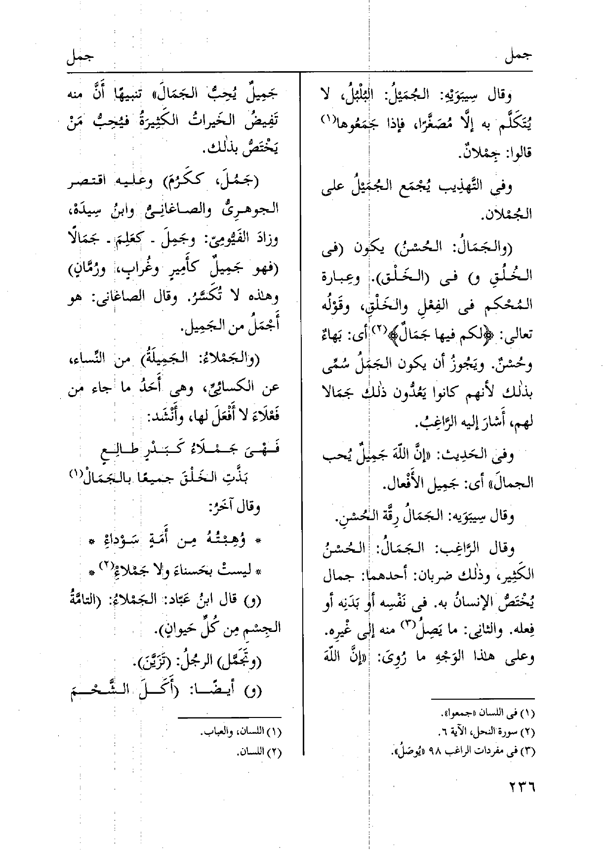 وَقَالَ الرَّاغِب: الجَمَالُ: الحُسْنُ الكَثِير، وَذَلِكَ ضَرْبَان: أَحدهمَا: جمال يُخْتَصُّ الإنسانُ بِهِ. فِي نَفْسِه أَو بَدَنِه أَو فِعله. وَالثَّانِي: مَا يَصِلُ مِنْهُ إِلَى غْيرِه. وعَلى هَذَا الوَجْهِ مَا رُوِيَ: إنَّ اللهَ جَمِيلٌ يحبُّ الجَمَالَ تَنْبِيها أَنَّ مِنْهُ تَفِيضُ الخَيراتُ الكَثِيرَةُ فيُحِب مَنْ يَخْتَصُّ بذلك. جَمُلَ، ككَرُمَ وَعَلِيهِ اقْتصر الجوهريّ والصاغانِيُّ وابنُ سِيدَهْ، وزادَ الفَيُّومِيّ: وجَمِلَ كعَلِمَ جَمَالاً فَهُوَ جَمِيلٌ كأَمِيرٍ وغُرابٍ، ورُمَّانٍ وَهَذِه لَا تُكَسَّرُ. وَقَالَ الصَّاغَانِي: هُوَ أَجْمَلُ من الجَمِيل.