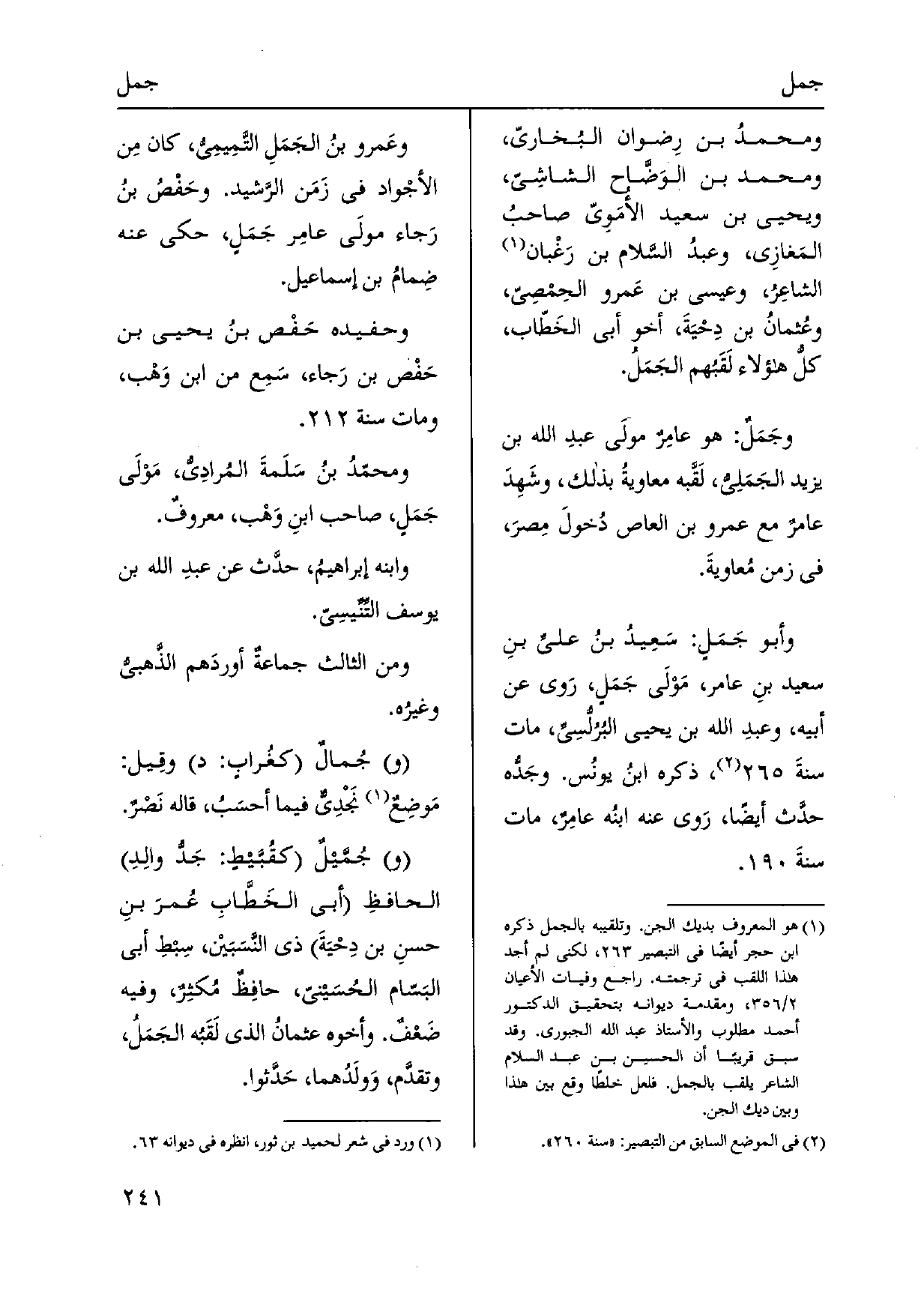 ومحمدُ بن رِضوان البُخارىّ، وَمُحَمّد بن الوَضَّاح الشاشِيّ، وَيحيى بن سعيد الأمَوِيّ صاحبُ المَغازِي، وعبدُ السَّلام بن رَغْبان الشاعِرُ، وَعِيسَى بن عَمرو الحِمصِيّ، وعُثمانُ بن دِحْيَةَ، أَخُو أبي الخَطّاب، كلُّ هَؤُلَاءِ لَقَبُهم الجَمَلُ. وجَمَلٌ: هُوَ عامِر مولَى عبدِ الله بن يزِيد الجَمَلِع، لًقّبه معاويةُ بذلك، وشَهِدَ عَامر مَعَ عَمْرو بن الْعَاصِ دُخولَ مِصرَ، فِي زمن مُعاويةَ. وَأَبُو جَمَلٍ: سَعِيدُ بنُ عليِّ بنِ سعيد بنِ عَامر، مَؤلَى جَمَلٍ، رَوى عَن أَبِيه، وعبدِ الله بن يحيى البُرُلُّسِيّ، مَاتَ سنةَ، ذكره ابنُ يونُس. وجَدُّه حدَّث أَيْضا، رَوى عَنهُ ابنُه عامِر، مَاتَ سنةَ. وعَمرو بنُ الجَمَلِ التَّمِيمِيُّ، كَانَ مِن الأجْواد فِي زَمَن الرَّشيد. وحَفْصُ بنُ رَجاء مولَى عامِر جَمَلٍ، حكى عَنهُ ضِمامُ بن إِسْمَاعِيل. وحفيده حَفْص بن يحيى بن حَفْص بن رَجاء، سَمِع من ابْن وَهْب، وَمَات سنة. ومحمّدُ بنُ سَلَمةَ المُرادِيُّ، مَولَى جَمَلٍ، صَاحب ابنِ وَهْب، معروفٌ. وَابْنه إبراهيمُ، حدَّث عَن عبدِ الله بن يُوسُف التنيسِيّ. وَمن الثَّالِث جماعةٌ أوردَهم الذَّهبيُّ وغيرُه. جُمالٌ كغُرابٍ: د وقِيل: مَوضِعٌ نَجْدِ فِيمَا أحسَبُ، قَالَه نَصْرٌ. جُمَّيلٌ كقُبَّيطٍ: جَدُّ والِدِ الحافظِ أبي الخطَّابِ عُمرَ بنِ حسنِ بن دِحْيَةَ ذِي النَّسَبَيْن، سبطِ أبي البَسّام الحُسَينيّ، حافِظٌ مُكثِرٌ، وَفِيه ضَعْفٌ. وَأَخُوهُ عثمانُ الَّذِي لَقَبُه الجَمَلُ، وتقَدّم، وَولَدُهما، حَدَّثوا.