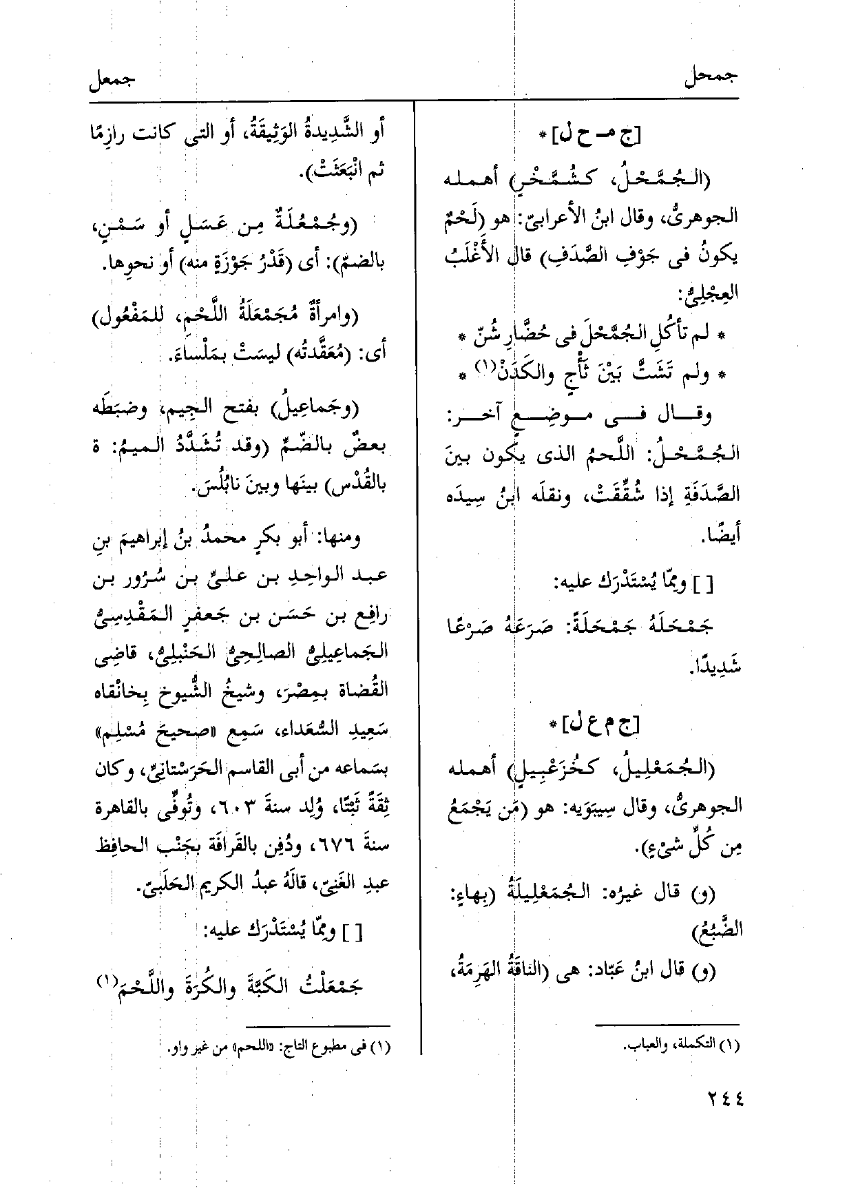الجمَعْلِيلُ، كخُزَعْبِيلٍ أهمله الجوهريّ، وَقَالَ سِيبَوَيه: هُوَ مَن يَجْمَعُ مِن كُلِّ شيءٍ. قَالَ غيرُه: الجُمَعْلِيلَةُ بِهاءٍ: الضَّبُعُ قَالَ ابنُ عَبّاد: هِيَ الناقَةُ الهَرِمَةُ، أَو الشَّدِيدةُ الوَثِيقَةُ، أَو الَّتِي كَانَت رازِماً ثمَّ انْبَعَثَتْ. وجُمْعُلَةٌ مِن عَسَلٍ أَو سَمْنٍ، بالضمّ: أَي قَدْرُ جَوْزَةٍ مِنْهُ أَو نحوِها. وامرأةٌ مُجَمْعَلَةُ اللَّحْمِ، للمَفْعُول أَي: مُعَقَّدتُه ليسَتْ بمَلْساءَ. وجَماعِيلُ بِفَتْح الجِيم، وضبَطَه بعضٌ بالضّمِّ وَقد تُشَدَّدُ الميمُ: ة بالقُدْس بينَها وبينَ نابُلُسَ. وَمِنْهَا: أَبُو بكرٍ محمدُ بنُ إبراهيمَ بنِ عبد الواحِدِ بن عليّ بن سُرُور بن رافِع بن حَسَن بن جَعفرٍ المَقْدِسِيّ الجَماعِيلِيّ الصالِحِيّ الحَنْبلِيّ، قاضِي القُضاة بمِصْرَ، وشيخُ الشُّيوخ بِخانْقاه سَعِيدِ الشعَداء، سَمِع صحيحَ مُسلِم بسَماعه من أبي الْقَاسِم الحَرَستانيّ، وَكَانَ ثِقَةً ثَبتاً، وُلِد سنةَ، وتُوفي بِالْقَاهِرَةِ سنةَ، ودُفِن بالقَرافَة بجَنْب الحافِظ عبدِ الغَنيّ، قالَهُ عبدُ الْكَرِيم الحَلَبيّ.