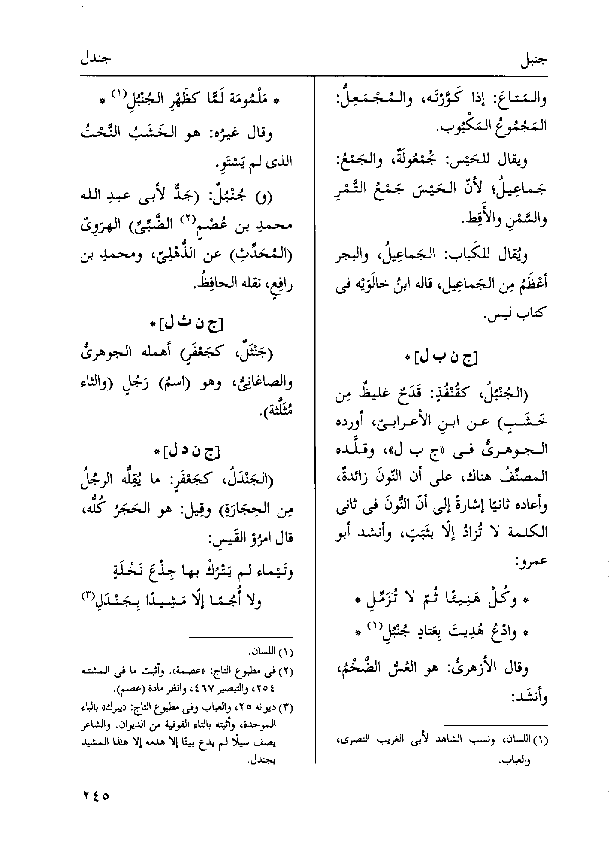 الجُنْبُلُ، كقُنْفُذٍ: قَدَحٌ غليظٌ مِن خَشَبٍ عَن ابنِ الأعرابيّ، أوردهُ الجوهريّ فِي ج ب ل، وقلَّده المصنِّفُ هُنَاكَ، على أَن النّونَ زائدةٌ، وَأَعَادَهُ ثَانِيًا إِشَارَة إِلَى أنّ النُّونَ فِي ثَانِي الْكَلِمَة لَا تُزادُ إلّا بثَبَتٍ، وَأنْشد أَبُو عَمْرو: وكُلْ هَنِيئاً ثُمّ لَا تُزَمِّلِ وادْعُ هُدِيتَ بِعَتادٍ جُنْبُلِ وَقَالَ الأزهريُّ: هُوَ العُسُّ الضَّخْمُ، وأنشَد: مَلْمُومَة لَمّاً كظَهْرِ الجُنْبُلِ وَقَالَ غيرُه: هُوَ الخَشَبُ النَّحْتُ الَّذِي لم يَستَوِ جُنْبُلٌ: جَدٌّ لأبي عبدِ الله محمدِ بن عُصْمٍ الضَّبيّ الهرَوِيّ المُحَدِّثِ عَن الذُّهْلِيّ، ومحمدِ بن رافِعٍ، نَقله الحافِظُ.