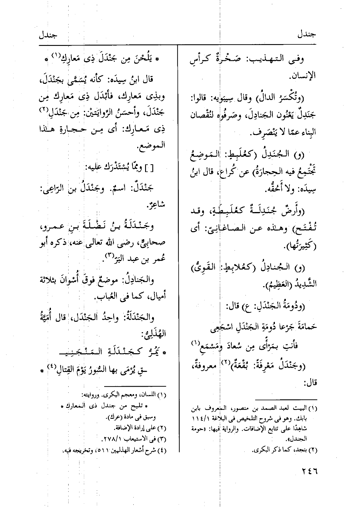 وَفِي التَّهْذِيب: صَخْرةٌ كرأسِ الْإِنْسَان. وتُكْسَرُ الدالُ وَقَالَ سِيبَويه: قَالُوا: جَنَدِلٌ يَعْنُون الجَنادِلَ، وصَرفُوه لنُقْصان البِناء عمّا لَا يَنْصَرِف. الجُنَدِلُ كعُلَبِطٍ: المَوضِعُ تَجْتَمِعُ فِيهِ الحِجارَةُ عَن كُراع، قَالَ ابنُ سِيدَ: وَلَا أَحُقّه. وأَرضٌ جُنَدِلَةٌ كعُلَبِطَةٍ، وَقد تُفْتَح وَهَذِه عَن الصاغانِي: أَي كَثِيرَتُها. الجُنادِلُ كعُلابِطٍ: القَوِىُّ الشَّدِ يدُ العَظِيمُ. ودُومَةُ الجَنْدَلِ: ع قَالَ: