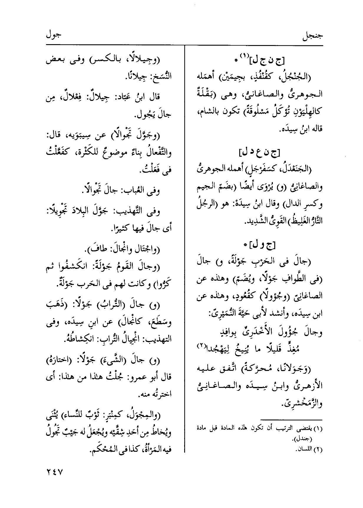 {وَجَوَلاناً، مُحرَّكةً اتَّفق عَلَيْهِ الأزهريُُّ وابنُ سِيدَه والصاغانِيُّ والزَّمَخْشرِيُّ.} وجِيلالاً، بِالْكَسْرِ وَفِي بعض النُّسَخ: جِيلاناً. قَالَ ابنُ عَبّاد: {جِيلالٌ: فِعْلالٌ، مِن جالَ يَجُول.} وجَوَّلَ {تَجْوالاً عَن سِيبَوَيه، قَالَ: والتَّفْعالُ بِناءٌ موضوعٌ للكَثْرة، كفَعَّلْتُ فِي فَعَلْتُ. وَفِي العُباب: جالَ} تَجْوالاً. وَفِي التَّهذيب: {جَوَّلَ البِلادَ} تَجْوِيلاً: أَي {جالَ فِيهَا كثيرا.} واجْتَال {وانْجالَ: طافَ.} وجالَ القَومُ {جَوْلَةً: انكَشفُوا ثمَّ كَروا وَكَانَت لَهُم فِي الحَرب} جَولَةٌ. (و) {جالَ التُّرابُ} جَوْلاً: ذَهَبَ وسَطَحَ، {كانْجالَ عَن ابنِ سِيدَه، وَفِي التَّهْذِيب:} انْجِيالُ التُّرابِ: انكِشاطُهُ. جالَ الشَّيْء جَوْلاً: اختارَهُ قَالَ أَبُو عَمْرو: {جُلْتُ هَذَا من هَذَا: أَي اخترتُه مِنْهُ.} والمِجْوَلُ، كمِنْبَرٍ: ثَوْبٌ للنِّساء يُثْنَى ويُخاطُ مِن أحَدِ شِقَّيه ويُجْعَلُ لَهُ جَيبٌ! تَجُولُ فِيهِ المَرْأةُ، كَذَا فِي المُحْكَم.
