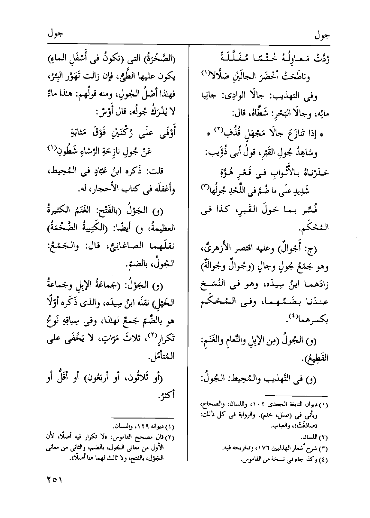 قلت: ذَكره ابنُ عَبّادٍ فِي المُحِيط، وأغفلَه فِي كتاب الْأَحْجَار، لَهُ. (و) {الجَوْلُ بالفَتْح: الغَنَمُ الكثيرةُ العظيمةُ، أَيْضا: الكَتِيبةُ الضَّخْمَةُ نقلَهما الصاغانِيُّ، قَالَ: والجَمْعُ:} الجُولُ، بالضمّ. (و) ! الجَوْلُ:) جَماعَةُ الإبِلِ وجَماعةُ الخَيلِ نقلَه ابنُ سِيدَه، وَالَّذِي ذَكَره أوّلاً هُوَ بالضَّمّ جَمعٌ لهَذَا، وَفِي سِياقِهِ نَوعُ تَكرارٍ، ثلاثَ مَرّاتٍ، لَا يَخْفى على المُتأمِّل. أَو ثَلاثُون، أَو أربَعُون أَو أقَلُّ أَو أكثرُ.