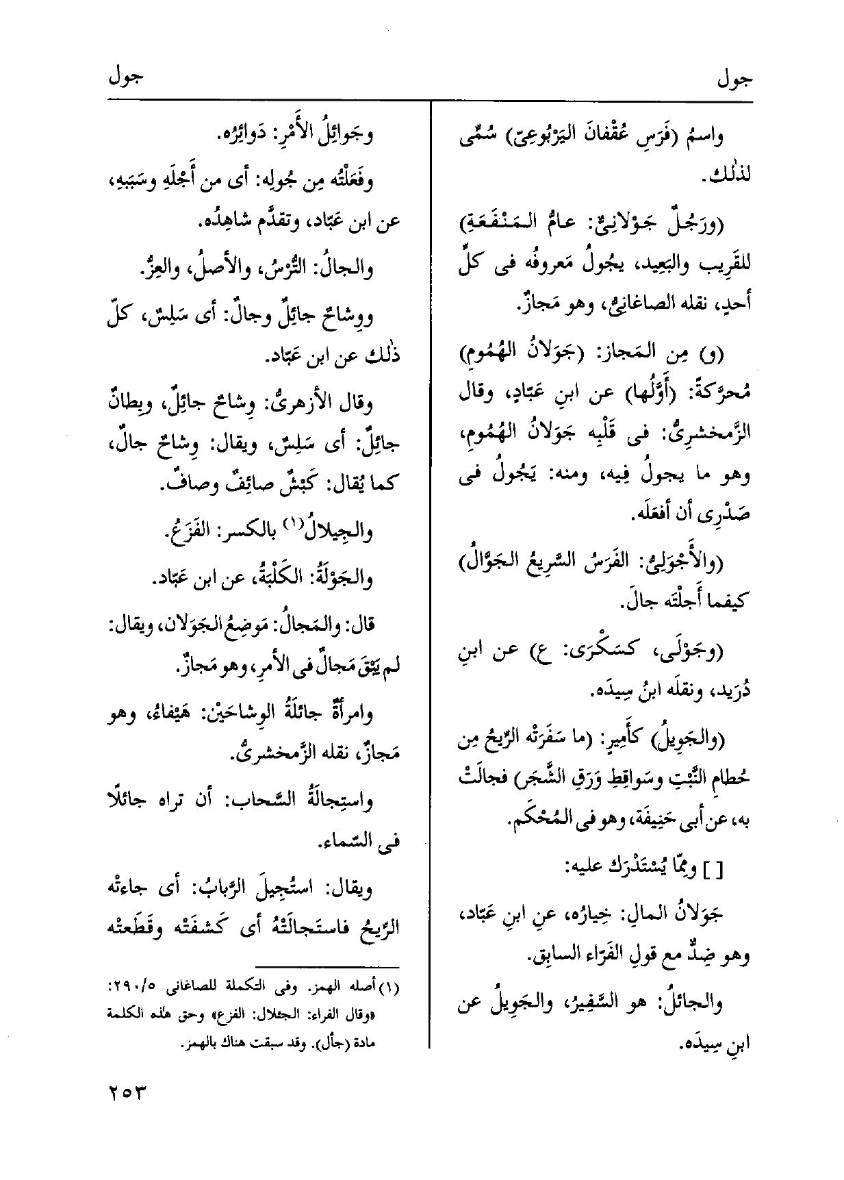 قَالَ: والمَجالُ: مَوضِعُ الجَوَلان، وَيُقَال: لم يَبقَ} مَجالٌ فِي الأمرِ، وَهُوَ مَجازٌ. وَامْرَأَة {جائلَةُ الوِشاحَينْ: هَيفاءُ، وَهُوَ مَجازٌ، نَقله الزَّمخشريٌّ.} واستِجالَةُ السَّحاب: أَن ترَاهُ {جائلاً فِي السّماء.