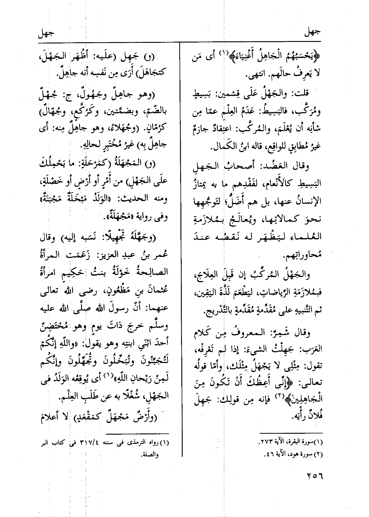 يَحْسَبُهُمُ الْجَاهِلُ أَغْنِيَاءَ أَي مَن لَا يَعرِفُ حالَهم. انْتهى. قلت: والجَهْلُ عَلَى قِسمين: بَسِيطٍ ومُرَكَّب، فالبَسِيطُ: عَدَمُ العِلْمِ عمّا مِن شأنِه أَن يُعْلَمَ، والمُركَّب: اعتِقادٌ جازمٌ غيرُ مُطابِقٍ للواقِع، قَالَه ابنُ الكَمال. وَقَالَ العَضُد: أصحابُ الجَهلِ البَسِيطِ كالأَنْعام، لفَقْدِهم مَا بِهِ يمتازُ الإنسانُ عَنْهَا، بل هم أَضَلُّ لتَوجُّهِها نحوَ كمالاتِها، ويُعالَجُ بمُلازَمةِ العُلماء ليَظْهَر لَهُ نَقصُه عندَ مُحاوراتِهم. والجَهْلُ المُركَّبُ إِن قَبِلَ العِلَاجَ، فبمُلازَمَةِ الرياضاتِ، ليَطْعَمَ لَذَّةَ اليَقِين، ثمَّ التَّنبيهِ على مُقَدِّمةٍ مُقَدِّمةٍ بالتَّدْريج. وَقَالَ شَمِرٌ: المعروفُ مِن كَلام العَرَب: جَهِلْتُ الشَّيْء: إِذا لم تَعْرِفْه، تَقول: مِثْلِي لَا يَجْهَلُ مِثْلَك، وأمّا قولُه تَعَالَى: إِنِّي أَعِظُكَ أَنْ تَكُونَ مِنَ الْجَاهِلِينَ فَإِنَّهُ مِن قولِك: جَهِلَ فُلانٌ رأْيَه. جَهِل علَيه: أظْهَر الجَهْلَ، كتجَاهَلَ أَرَى مِن نَفسِه أَنه جاهِلٌ. وَهُوَ جاهِلٌ وجَهُولٌ، ج: جُهْلٌ بالضّمّ، وبضمَّتين، وكَرُكَّعٍ، وجُهّالٌ كرُمّانٍ. وجهَلاءُ، وَهُوَ جاهِلٌ مِنه: أَي جاهِلٌ بِه غيرُ مُخْتَبِرٍ لحالِهِ.