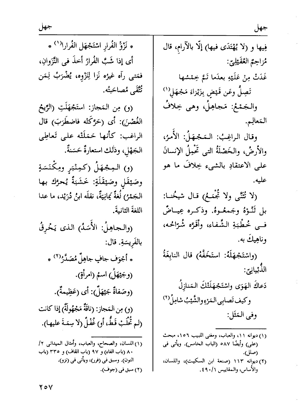 وَفِي المَثَل: نَزْوَ الفُرارِ اسْتَجْهَل الفُرارا أَي إِذا شَبَّ الفُرارُ أخذَ فِي النَّزَوانِ، فمَتى رَآهُ غيرُه نَزا لِنَزْوِه، يُضْرَبُ لِمَن تُتَّقَى مُصاحَبتُه. مِن المَجاز: استَجْهَلَتِ الريحُ الغصْنَ: أَي حَرَّكَتْه فاضطَرَبَ قَالَ الرَّاغِب: كَأَنَّهَا حَمَلَتْه على تَعاطِي الجَهْلِ، وَذَلِكَ استعارةٌ حَسَنةٌ. المِجْهَلُ كمِنْبَرٍ ومِكْنَسَةٍ وصَيقَلٍ وصَيقَلَةٍ: خَشَبَةٌ يُحرَّك بهَا الجَمْرُ لُغةٌ يَمانِيَةٌ، نقلَه ابنُ دُرَيْد، مَا عدا اللغةَ الثانيةَ. والجاهِلُ: الأَسَدُ الَّذِي يَخْرِقُ بالفَرِيسَةِ. قَالَ: أجْوَف جافٍ جاهِلٌ مُصَدَّرُ وجَيهَلُ اسمُ امرأةٍ. وصَفاةٌ جَيهَلٌ: أَي عَظِيمهٌّ. مِن المَجاز: ناقَةٌ مَجْهُولةٌ إِذا كَانَت لم تُحلبْ قَطُّ، أَو غُفْلٌ لَا سِمَةَ عَلَيْهَا.