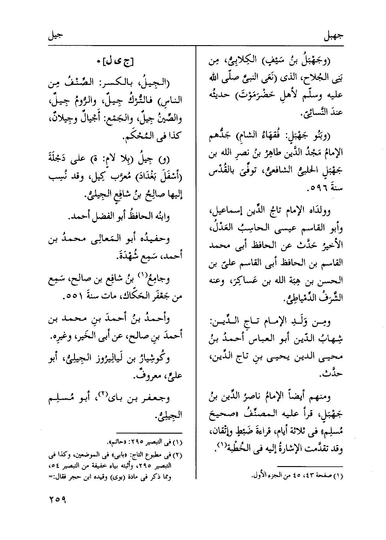 {الجِيلُ، بِالْكَسْرِ: الصِّنْفُ من الناسِ فالتُّركُ} جِيلٌ، والرُّومُ جِيلٌ، والصِّينُ جِيلٌ، والجَمْع: {أَجْيالٌ} وجِيلانٌ، كَذَا فِي المُحْكَم. جِيلُ بِلا لامٍ: ة على دَجلَةَ أسْفَلَ بَغْدَادَ مُعرَّب كِيل، وَقد نُسِب إِلَيْهَا صالِحُ بنُ شافِعٍ! - الجِيليُّ. وابنُه الحافظُ أَبُو الْفضل أَحْمد. وحفيدُه أَبُو المَعالِي محمدُ بن أَحْمد، سَمِع شُهْدَةَ. وجامِعُ بنُ شافِع بن صَالح، سَمِع من جَعْفَر الحَكّاك، مَاتَ سنةَ. وأحمدُ بنُ أحمدَ بنِ مُحَمَّد بن أحمدَ بنِ صَالح، عَن أبي الخَير، وغيرِه. وكُوشِيارُ بن لَيالِيرُوز الجِيلِيُّ، أَبُو عليٍّ، معروفٌ. وجعفر بن باي، أَبُو مُسلِم الجِيلِيُّ.