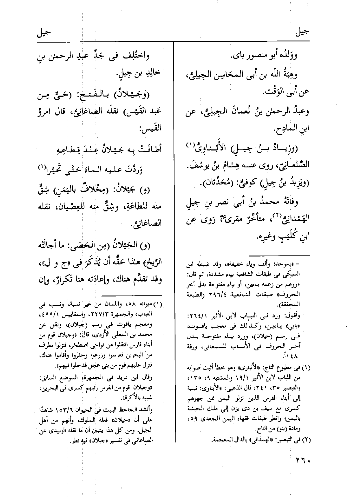 ووَلدهُ أَبُو مَنْصُور باي. وهِبَةُ الله بن أبي المحَاسِن الجِيلِيّ، عَن أبي الوَقْت. وعبدُ الرَّحْمَن بنُ نُعمانَ الجِيلِيُّ، عَن ابنِ المادِح. وزِيادُ بنُ جِيلٍ الأَبْناوِيُّ الصَّنْعاني، روى عَنهُ هِشامُ بنُ يوسُفَ. ويَزِيدُ بنُ جِيلٍ كوفيٌّ: مُحَدِّثان. وفاتَهُ محمدُ بنُ أبي نصر بنِ جِيلٍ الهَمْدانيّ، متأخِّرٌ مقرئ، رَوى عَن ابنِ كُلَيب وغيرِه. واختُلِف فِي جَدِّ عبدِ الرَّحْمَن بنِ خالِدِ بن جِيلٍ. {وجَيلانُ بالفَتح: حَيٌّ مِن عَبد القَيس نقلَه الصاغانيّ، قَالَ امْرُؤ القَيس: