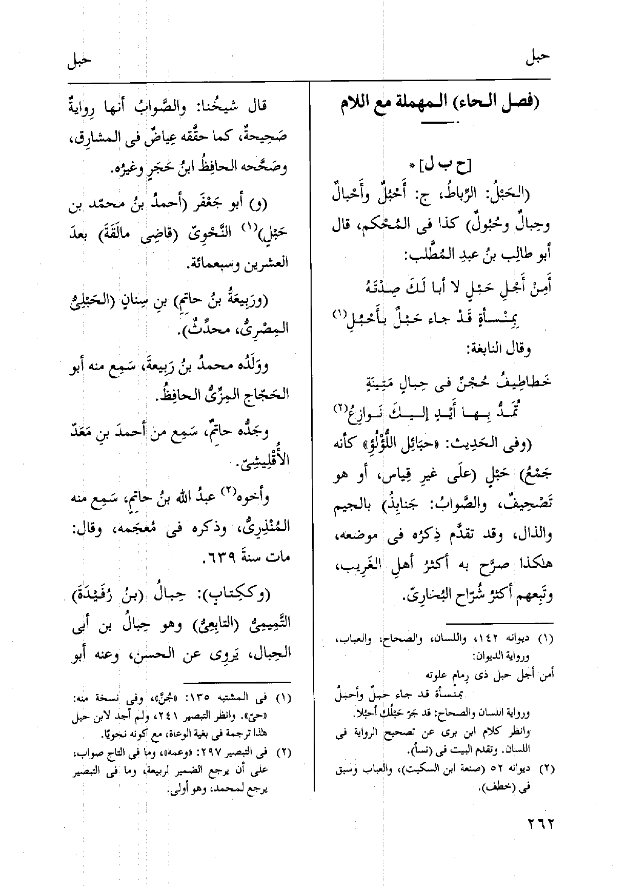 وَفِي الحَدِيث: حبَائِل اللؤْلُؤِ كَأَنَّهُ جَمْعُ حَبلٍ علَى غيرِ قِياس، أَو هُوَ تَصْحِيفٌ، والصَّوابُ: جَنابِذُ بِالْجِيم والذال، وَقد تقدَّم ذِكرُه فِي مَوْضِعه، هَكَذَا صرَّح بِهِ أكثرُ أهلِ الغَرِيب، وتَبِعهم أكثرُ شُرّاح البُخارِيّ. قَالَ شيخُنا: والصَّواب أَنَّهَا رِوايةٌ صَحِيحةٌ، كَمَا حقَّقه عِياضٌ فِي المشارِق، وصَحَّحه الحافِظُ ابنُ حَجَرٍ وغيرُه. أَبُو جَعْفَر أحمدُ بنُ محمّد بن حَبلٍ النَّحْوِيّ قاضِي مالَقَةَ بعدَ الْعشْرين وَسَبْعمائة. ورَبِيعَةُ بنُ حاتِمِ بنِ سِنانٍ الحَبلِيّ المِصْرِيُّ، محدِّثٌ. ووَلَدُه محمدُ بنُ رَبِيعةَ، سَمِع مِنْهُ أَبُو الحَجّاج المِزِّيُّ الحافِظُ. وجَدُّه حاتِمٌ، سَمِع من أحمدَ بنِ مَعَدّ الأُقْلِيشِيّ.