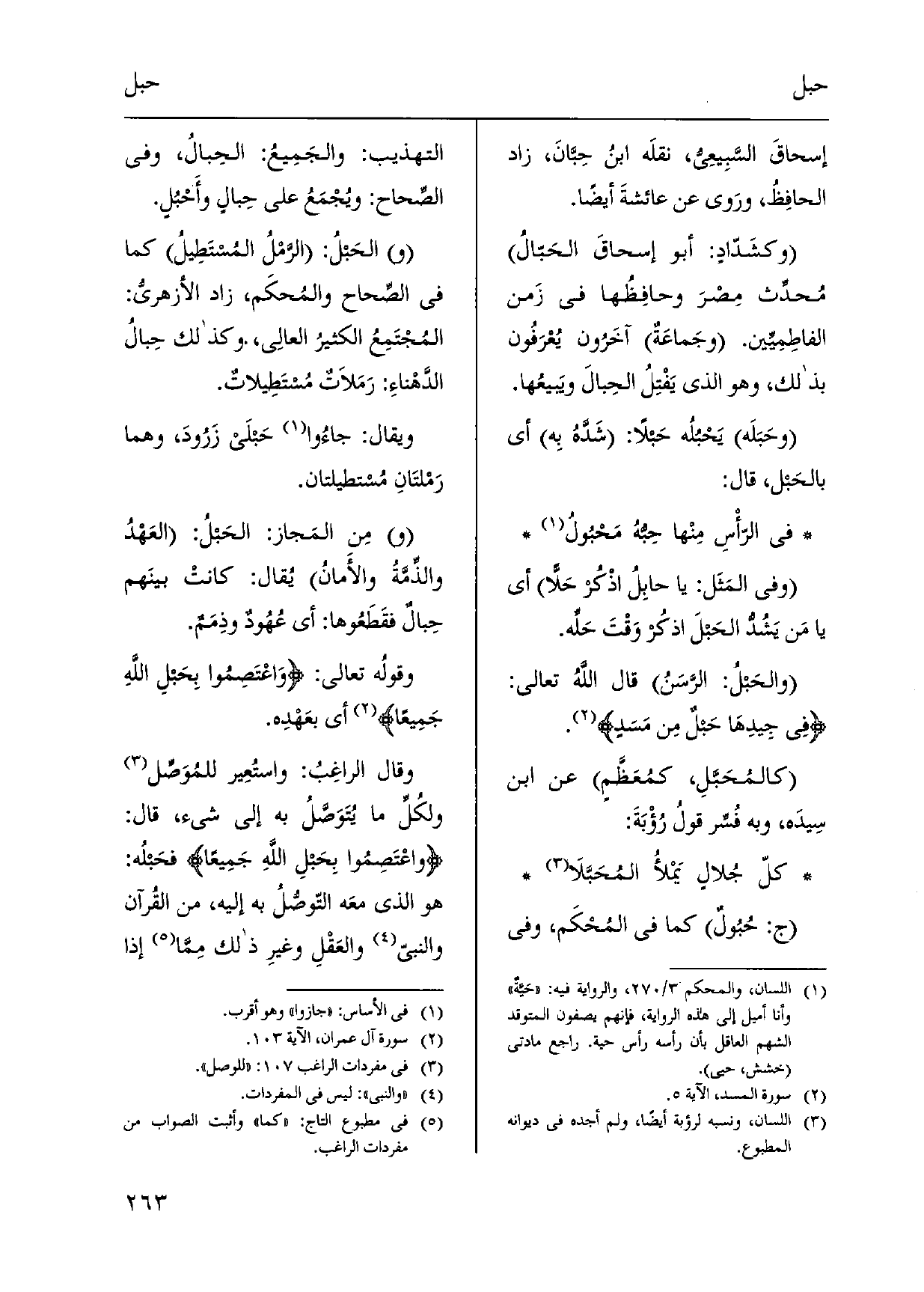 وَفِي المَثَل: يَا حابِلُ اذْكُر حَلاً أَي يَا مَن يَشُدُّ الحَبلَ اذكُر وَقْتَ حَلِّه. والحَبلُ: الرَّسَنُ قَالَ اللَّهُ تَعَالَى: فِي جِيدِهَا حَبلٌ مِن مَسَدٍ. كالمُحَبَّلِ، كمُعَظَّمٍ عَن ابْن سِيدَه، وَبِه فُسِّر قولُ رُؤْبَةَ: كلّ جُلالٍ يَملأُ المُحَبَّلَا ج: حُبُولٌ كَمَا فِي المُحْكَم، وَفِي التَّهْذِيب: والجَمِيعُ: الحِبالُ، وَفِي الصِّحاح: ويُجْمَعُ على حِبالٍ وأَحْبُلٍ. الحَبلُ: الرَّمْلُ المُستَطِيلُ كَمَا فِي الصِّحاح والمُحكَم، زَاد الأزهريُّ: المُجْتَمِعُ الكثيرُ العالِي،. وَكَذَلِكَ حِبالُ الدَّهْناءِ: رَمَلاَتٌ مُسْتَطِيلاتٌ. وَيُقَال: جاءُوا حَبلَى زَرُودَ، وهما رَمْلتَانِ مُسْتطيلتان. مِن المَجاز: الحَبلُ: العَهْدُ والذِّمَّةُ والأَمانُ يُقال: كانتْ بينَهم حِبالٌ فقَطَعُوها: أَي عُهُودٌ وذِمَمٌ. وقولُه تَعَالَى: وَاعْتَصِمُوا بِحَبلِ اللهِ جَمِيعاً أَي بعَهْدِه. وَقَالَ الراغِبُ: واستُعِير للمُوَصِّل ولكُلِّ مَا يُتَوَصَّلُ بِهِ إِلَى شَيْء، قَالَ: واعْتَصِمُوا بِحَبلِ اللَّهِ جَمِيعاً فحَبلُه: هُوَ الَّذِي معَه التّوصُّلُ بِهِ إِلَيْهِ، من القُرآن وَالنَّبِيّ والعَقْلِ وغيرِ ذَلِك مِمَّا إِذا